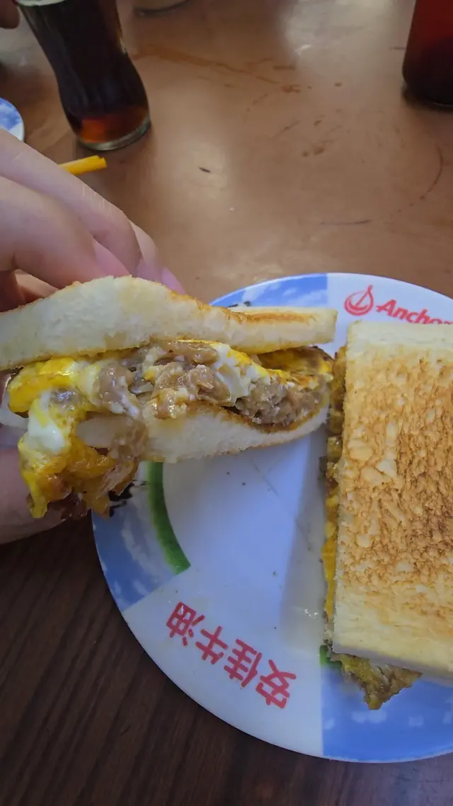 第二站就去食馳名蛋牛治。其實唔係第一次食,但係每次黎深水埗搵野食,都會記起要食佢。由於佢店面唔大,加上國慶假期,所以去到都要等一陣位,而且要搭枱。當然叫左份蛋牛治烘底。記得 記得 記得 烘底!!!另外叫左杯凍檸茶。同我同枱既4個人都係叫蛋牛治😂可見出名程度。唔洗等好耐食物就送到。香!確實係香!烘底既麵包香,燶邊既碎牛蛋餅既肉香蛋香,仲有少少牛油香味。唔係要影低,一送到就已經想拎黎食🤤影完就急不及待進食,烘底多士香脆,碎牛蛋餅足料,調味適中唔會太咸,同以前食既味道一樣,唔錯。值得留意係設有最低消費,淨係蛋牛治會爭幾蚊,可能要諗吓仲想食咩,或者叫杯野飲。馳名蛋牛治 $24 (烘底+$1)凍檸茶 $19…查看更多