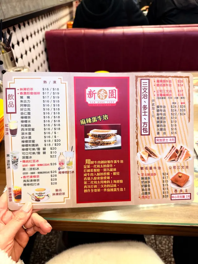 朋友仔落香港玩,指名要試深水埗敲🔥的【新香園】蛋牛治😋這次帶他來汝州街這間是🆕分店~環境好比老店寬敞,保留傳統茶記風味之余,又有不少創意菜✨出了🆕的麻辣蛋牛治、豬手、芒果檸檬茶等,選擇好豐富!🥪b試!出名的蛋牛治!🆕店多了麻辣味!這次原味和麻辣味通通試一遍新鮮熱辣敲美味🌶️麻辣味帶點點甜辣的感覺 風味up!🍜 雙蛋沙爹牛粗面沙爹好濃香,牛肉夠曬嫩~粗面口感爽滑彈牙,朋友說好喜歡🍗瑞士汁雞翼:夠大只!油亮亮的讓人好有食慾,咸咸甜甜好入味🍞西多士:炸得金黃色、脹啵啵!內里花生醬,焦脆的表面淋了蜜糖~來香港少不了這一份🥤黑白涼粉冰和凍鴛鴦,還有紅豆冰、菠蘿冰等港式風味飲品 好多選擇哦查看更多