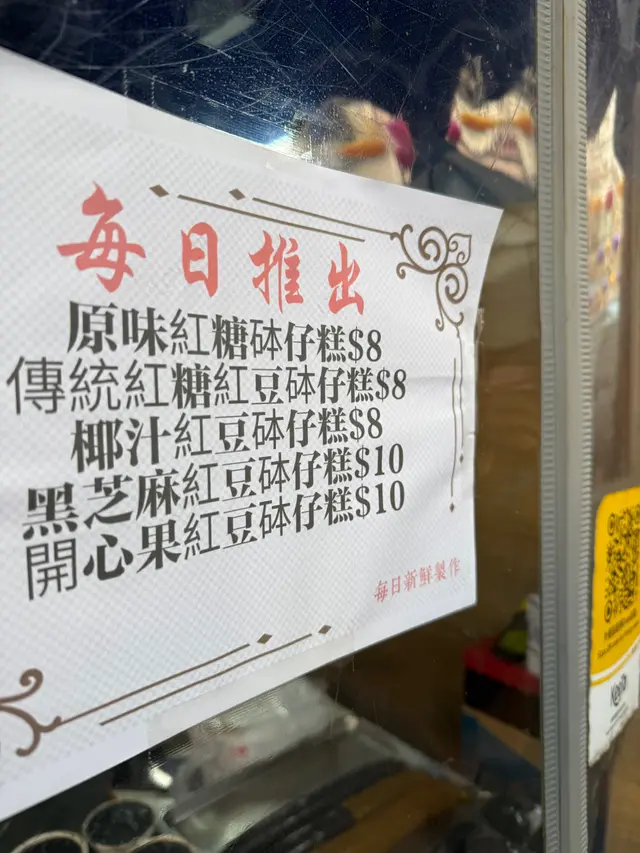 好耐好耐經過, 但一直未有機會試, 今日去佐敦個邊, 忽然想試一下, 原來有好多款, 有白色砵仔糕, 有黃🫘色砵仔糕, 有芝麻糕, 芝麻卷, 白糖糕, 黃糖糕, 紅豆🫘糕, 馬豆糕, 綠豆糕, 千眉豆糕, 亦有馬蹄糕, 紅棗糕, 桂花糕😘, 沒有華麗的裝修, 好簡單的小店, 試左一件紅豆🫘黃糖砵仔糕, 原來唔止面層多豆, 連糕底全部都係豆😁, 咬一口, 有QQ爽彈的感覺😘👍, 唔會感覺好硬, 有驚喜, 味道也不錯, 有下次🤩, 不過我個人食野偏淡, 就覺得甜左dd😅, 但也可以接受😋 下次再過來, 再試下其他款先😍