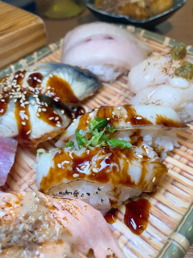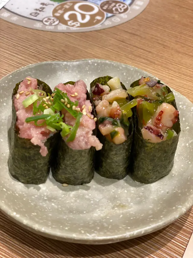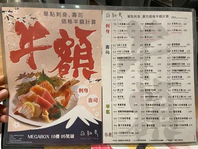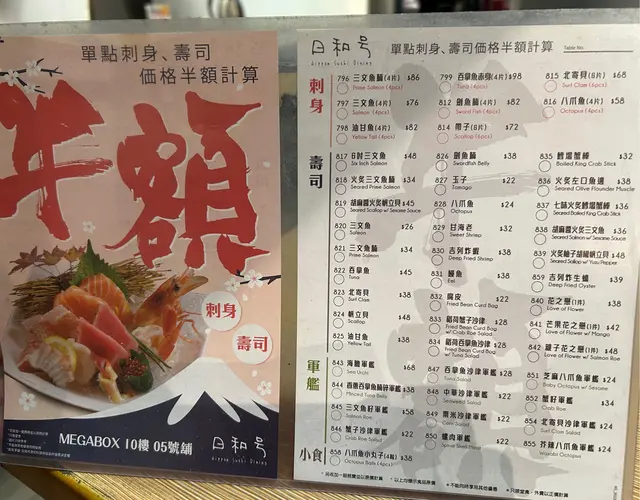 呢晚收工黎到mega box 10樓 日和号壽司料理 以日本列車做主題,近日推出左半額壽司刺身優惠~即刻試試佢只要在QR code 上看到半額的都能點!點左刺身4款:三文魚 帶子 油甘魚 北寄貝 4款黎講最靚仔充滿油香係油甘魚,帶子有鮮味,但略同嫌薄切左d 點左壽司共12款三文魚子 /海膽軍艦 /劍魚腩壽司鰻魚壽司 /火炙柚子胡椒帆立貝壽司火炙左口魚邊壽司 /北寄貝沙律軍艦 胡麻醬火炙三文魚壽司/香蔥吞拿魚腩碎軍艦 火炙三文魚腩壽司/吞拿魚壽司 油甘魚壽司 壽司方面較喜愛軍艦系列,如海膽、三文魚籽等塞滿料八爪魚小丸子 $38 熱辣辣,口感偏軟身!梅子青檸梳打 $33 挺特別口味 巨峰梳打 $33正常味道…查看更多