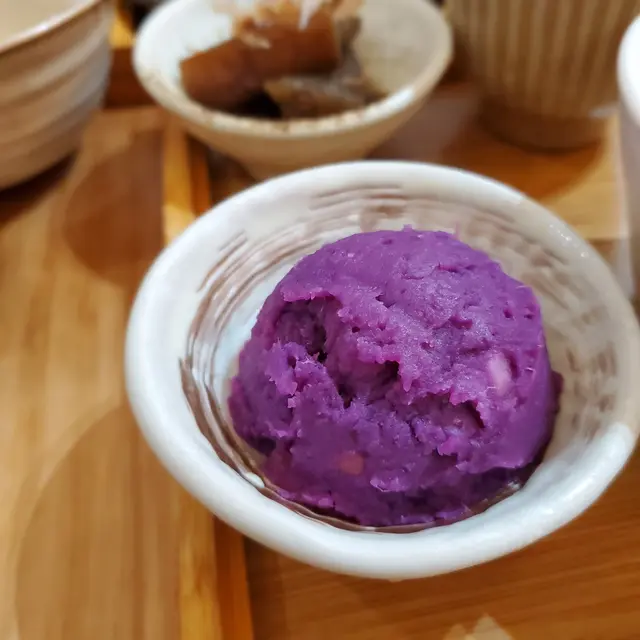紫薯球質感棉密,淡甜味道,中間夾雜著青蘋果粒粒,添了一些爽脆口感