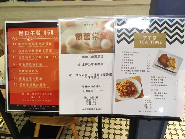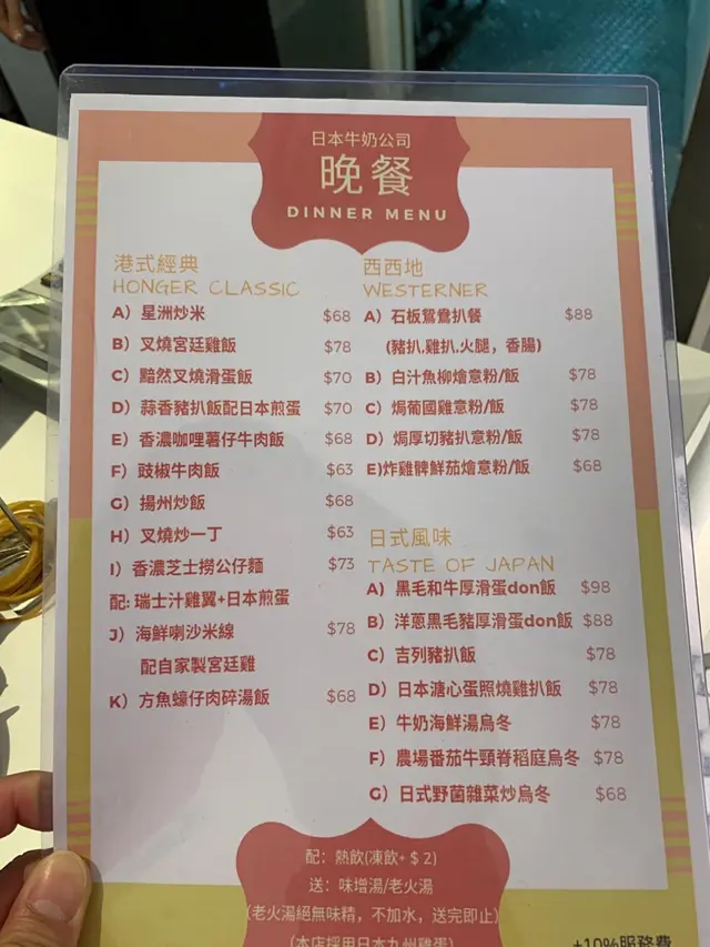 今日專登過嚟荃灣「千色店」買嘢,因為幾件家品都先後打柴,喺時候要換。完成任務,但行吓行吓都過埋食晏時間,所以,過咗嚟千色匯搵食,無嚟一排,都轉咗唔少餐廳。最後,見到間「日本牛奶公司」,日本九州雞蛋喺其亮點,老婆又喜歡食啲健康有質素嘢,就決定揀呢間。開放式設計,所以,整個環境晌門口都可以一眼睇晒,一室以白色為主調,格局偏向時下新興嘅冰室,走簡約路線。晌入門口位,樹立咗「招牌」菜式 - 「全日常餐」,賣點就喺採用九州雞蛋嚟做炒滑蛋。不過,題外話吖,個牌打少咗「滑蛋」兩個字,而變成厚牛油厚多士,此外,如果有留意到左下角有加一服務費嘅字仔,證明你睇嘢夠仔細,小弟當時就真喺無為意喇。我哋喺星期六晏晝3:00pm幫襯嘅,所以,既有是日午餐(無講供應時間至幾點完),亦有下午茶餐(同樣無提及供應時間),餐飲可以加錢轉特飲。再睇埋佢哋嘅「常餐」餐牌,標示咗供應時間喺10:30am - 6:00pm,咁……仲喺唔喺「全日」常餐呢?不過,唔知後尾會唔會番啲供應時間,總之,睇完晒啲餐牌後,唯一嘅感覺就喺啲資訊好亂火腿、滑蛋、多士(常餐)睇樣就幾對辦,炒滑蛋亦都好多,入口啲蛋確喺好滑身吓,而且,蛋味亦濃郁,配上脆口嘅烘多士,已經好唔錯;其實,寫明喺金妹火腿,個人而言,就唔覺有咩賣點,覺得喺基本,因為坊間有啲來佬嘅火腿仲優質,正如我話俾你知喺嘉頓方包,你都唔覺得喺咩嘢,但如果喺某出名麵包店嘅方包,感覺先會喺唔同啲。金牌沙嗲牛肉麵(常餐)加上「金牌」兩個字聽起嚟勁啲,但實際上又真喺唔錯喎,因為,牛肉嘅份量足,又唔會碎濕濕咁,而且,好腍滑,個沙嗲汁亦調校得惹味香濃;公仔麵煮得火喉好,因為俾錢時問過喺咩麵,雖然都喺茶記常用嘅大光麵,但無話有過腍嘅情況。日式雜菜炒烏冬 $40另外,清清哋嗌咗個下午茶餐嘅炒烏冬,份量都大大碟,無欺場,而雜菜都喺啲菇菌呀、椰菜呀、甘筍呀之類。食起嚟有種好有鑊氣嘅感覺,味道亦唔錯,唯一較大嘅問題喺油多,感覺比較膩。熱奶茶、熱杏霜我當呢度喺茶記,所以,點咗杯奶茶,茶底醇厚芳香,不過,老實講,滑溜感就真喺欠奉。反而,老婆杯杏霜幾好,好香杏仁味。溫馨提示,餐廳暫時只收現金,晌呢個盛行電子錢包嘅年代,最起碼嘅八達通都無,真喺對普遍人嚟講好唔方便。仲有,埋單時,先見到收銀旁楝個牌仔,寫住星期一至五6:00pm後,及星期六、日、假期全日,收加一,感覺絕對唔好。因為,一來多多少少茶記格局,無咩服務可言,但侍應都好有禮貌嘅,二來至少晌啲餐牌明確列明,唔好等啲客俾錢先知(註:門口嘅常餐大招牌喺有,但啲字鬼鼠又細粒,星期六、日、公眾假期梗喺後加添)查看更多