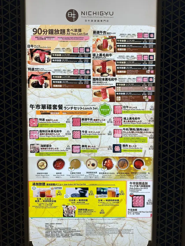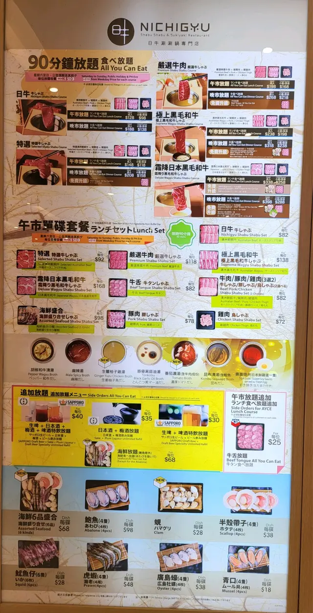 日本霜降黑毛和牛 / 自助區任食 / 乳酪雪糕 / 海鮮盛合 / 壽喜燒湯底