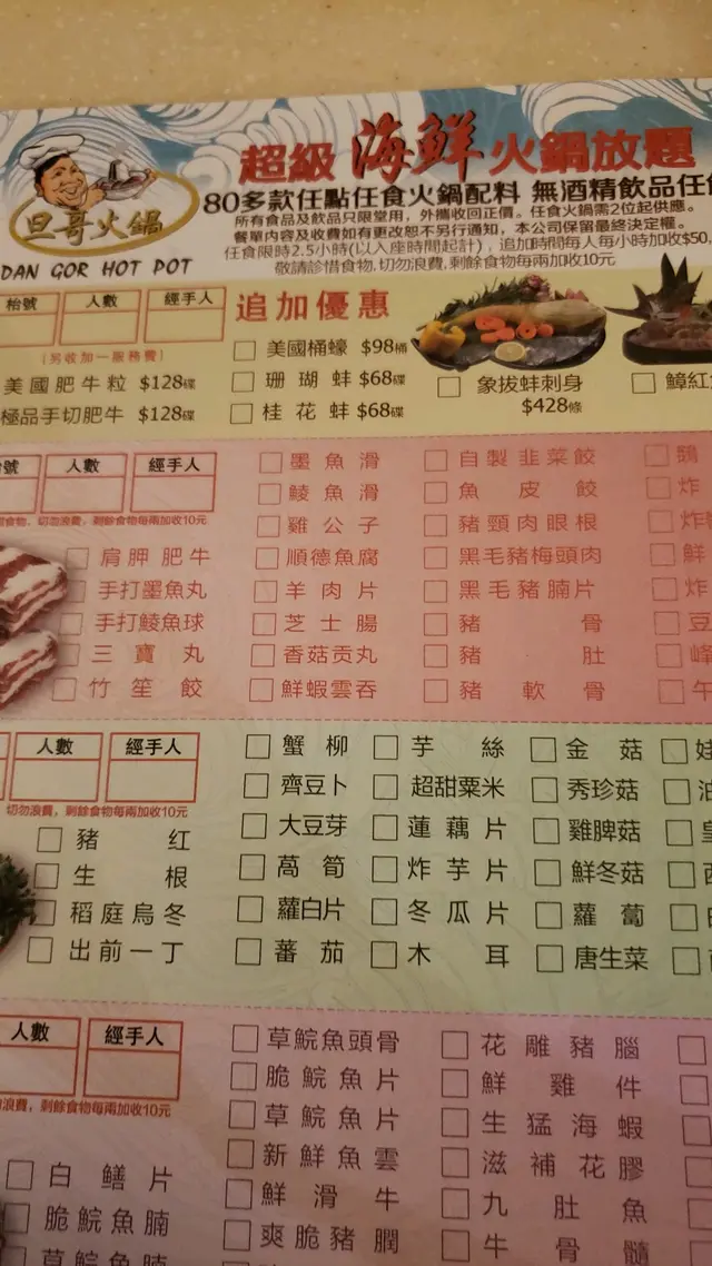 旦哥火鍋 (佐敦) 網址: https://s.openrice.com/QrbS0oEe600 地址: 香港佐敦白加士街10-24號永富大廈1樓 電話: +852 27307799