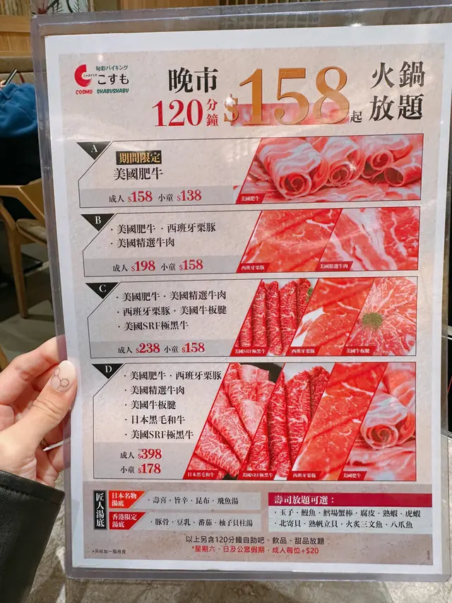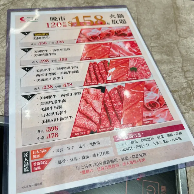 以百多元(加一前)的任食火鍋來說尚算不俗。食物品質可以,環境舒適寬敞。整體衛生環境理想。汽水,甜點,雪糕也有很多選擇。這個價錢來說,CP值非常高。特別係d蜆,非常鮮甜,值得推介。仲有壽司放題。小朋友來都可以有不同的選擇。湯底選擇也不小,鍾意佢哋個飛魚湯,好鮮味。主菜牛肉豬肉來講,算係正常發揮,話晒我哋都係試佢個入門級的set。不會奢望有手切本地肥牛呱。如果對肉類有要求的人就應該叫佢哋個高級版本,有黑毛和牛。查看更多