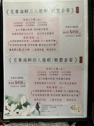 白胡椒粉絲龍蝦煲/黑胡椒龍蝦/薑蔥龍蝦伊面 / 旺角避风塘炒蟹/白胡椒粉絲蟹煲/新加坡黑胡椒蟹/經理薑蔥炒蟹 / 旺角椒盐濑尿虾/清酒浸鮑魚/豉汁炒大蜆 / 杏汁菜膽豬肺湯/薑蔥桶蠔煲 / 旺角金沙蝦球/清蒸虎杉班