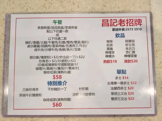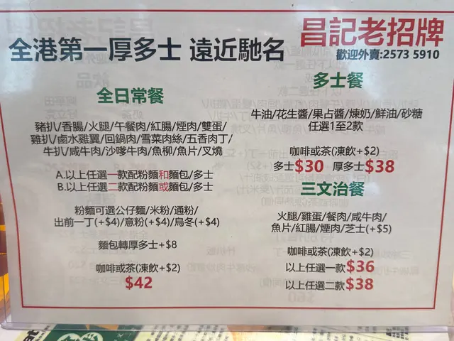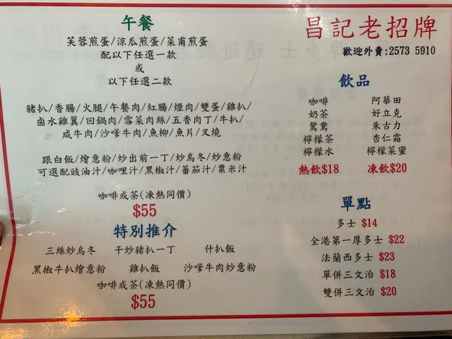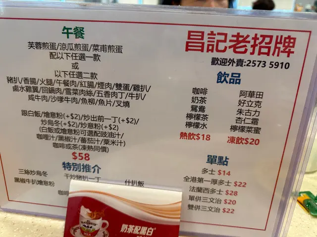 位於市政大廈街市2 樓大家放心現在的熟食中心全部都有冷氣,不會食到身水身汗。入到去街市有不少食肆,吾好坐錯,搵好昌記後姐姐會幫你搵位,樓面以女性主導,家庭生意,她們都幾友善。同事點了麵餐、飯餐,$4-50 左右,當然比附近的茶餐廳平宜。我就目標只有一樣 ——厚多士 套餐配一杯飲品 $38大約5 分鐘左右我的厚多士送上