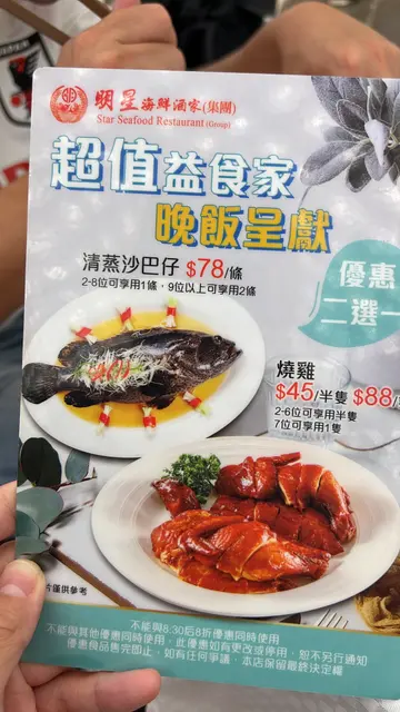 同屋企人慶祝生日,叫左半圍菜,一共11道菜,整體食物水平中上,份量大性價比高,適合一家人或與長輩慶生。1. 上湯龍蝦伊麵味道: 6/10性價比: 7/10推薦: 6/10伊麵味道偏淡,但份量超多,汁都偏少,龍蝦不太新鮮,肉質一般,但內有3隻龍蝦肉,份量都多。2. 蠔皇玉掌扣鮑魚味道: 8/10 ⭐️性價比: 8/10 ⭐️推薦: 8/10⭐️鮑魚新鮮大隻入味,鵝掌大隻且入口即化,煮得入味熟度剛剛好,份量大,值得一試👍🏻3. 清蒸大東星斑味道: 7/10性價比: 8/10⭐️推薦: 7/10魚新鮮且熟度剛剛好,好大條,肉質鮮嫩,但調味相對普通。…查看更多