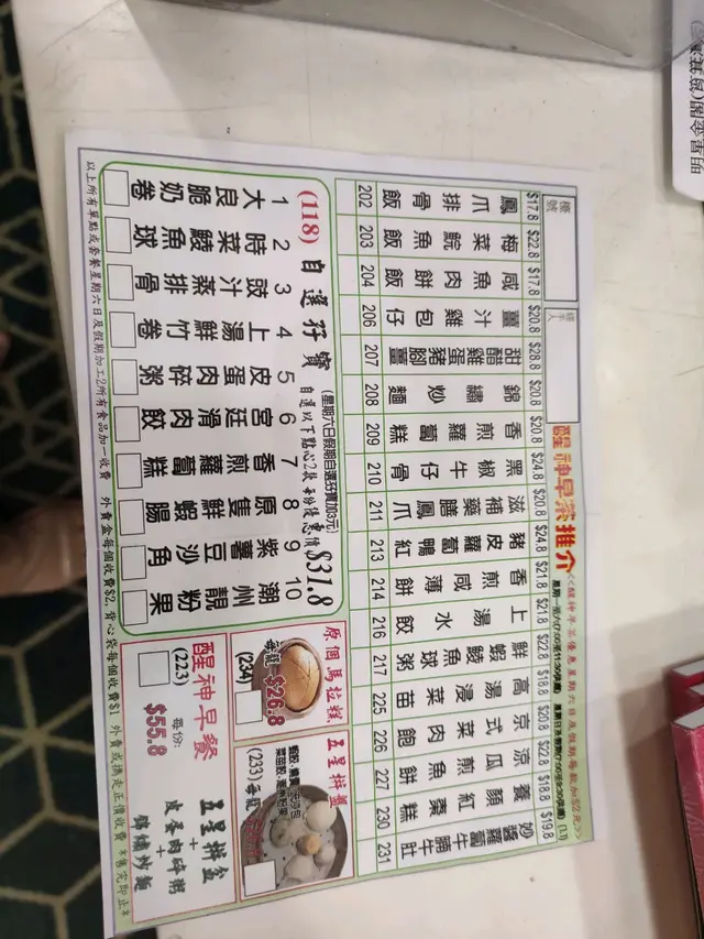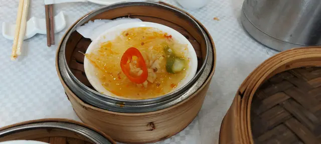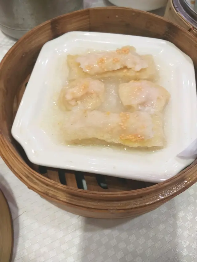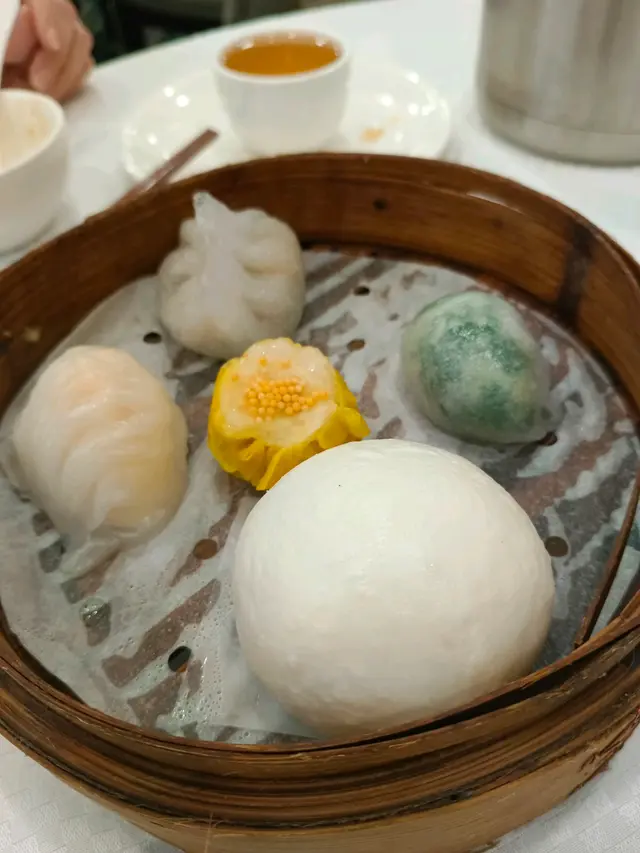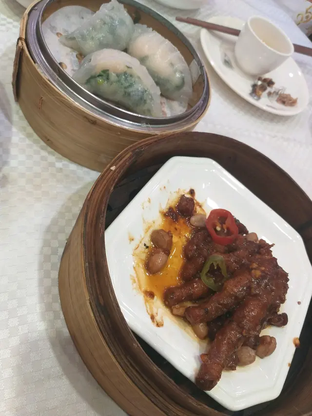 上次食小菜覺得不過不失,今次就黎飲早茶,8點幾已經座無虛席,幸好早起嘅老人家已入座,點了以下點心:1. 自選孖寶 - 豉汁蒸排骨 + 鮮蝦腸粉:質素唔差,味道適合,腸粉唔會一夾就散,蝦幾大隻又爽口,排骨都幾大粒,都係一般味道冇特別。2. 香煎鹹薄餅:賣相難有唔同,夠熱仲有點脆口又唔油膩,幾開胃。3. 妙醬蒸鳳爪:味道都係跟大眾差唔多冇特別,只係雞腳幾大隻,一碟有6-7隻,算幾多。4. 蟹籽燒賣:有四粒大大粒,比外面食還要大粒,食落去都唔粉。5. 明星鮮蝦餃:隻蝦雖然幾大,個皮厚左少少搞到咬落去太煙韌,影響口感。6. 鳳爪排骨飯:兩者都冇散叫咁大隻/粒,都係好食夠熱。7. 魚肚蝦滑雞扎:魚肚幾厚身又夠腍,蝦滑幾香幾彈牙。8. 菜苗餃:個餡冇咩味,個皮都係比較厚。基本上點心即叫即蒸,夠熱味道適中,煎物夠香口,老人家第一次黎飲早茶都讚不絕口,服務態度幾好。查看更多