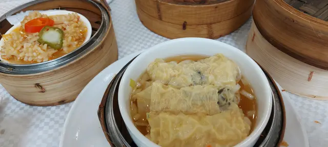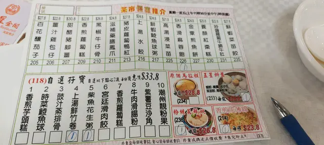 同朋友約咗喺筲箕灣飲茶,之前間点心專門店原來已經結業,就去咗附近嘅明星金閣飲茶,坐扶手电梯上去,午飯時間,見有幾個人等位,唔算多人,問服務員攞位,好快就安排兩人桌俾我哋。睇餐牌,有茶市優惠推介,自選孖寶,揀咗上湯鮮竹卷同柴魚花生粥。柴魚花生粥算是足料,但味道只是一般。蒸魷魚賣相不佳,味道亦一般鮮竹卷算是味道正常薄餅比較腍同有啲濕,唔夠香脆点心拼盤有蝦餃,燒賣,潮州粉果,菜苖餃,奶皇飽五樣麻蓉包本來係我嘅至愛,但呢度個餡料就係濕同唔夠香滑整體而言,呢度点心普通,但係唔算太差,服務亦一般,但勝在價錢唔貴,午市茶錢每位十一蚊,六樣点心埋單唔駛兩百蚊,算是抵食。查看更多