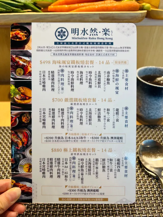 台灣出晒名一位難求既人氣網紅名店《明水然 • 樂》喺香港開咗分店喇!Book咗好耐終於輪到我哋去試啦😍呢間鐵板燒好架勢:連續2年榮獲{十大高CP值頂級無菜單鐵板燒}冠軍🥇台灣Google評論高達4.8分!標榜「日式無菜單鐵板燒」,菜式由香港、日本、台灣同新加坡主廚共同研發。每一道餐點都歷經過百次以上不斷測試、研發後先會加入菜單,成品絕對一絲不苟!全日主要提供兩個menu,兩個人嚟就啱晒可嘆足14品嘅Omakase鐵板燒料理。✨人氣No.1套餐 CP值⬆️ 嚴選鐵板燒套餐 $700 👉🏻 主要食材:龍蝦三吃、活鮑魚、北海道鮮貝、和牛二食、魚料理, 肉料理,更可以加$200升級日本A4/A5和牛✨限定極上鐵板燒套餐 $880👉🏻龍蝦四吃、北海道鮮貝、活鮑魚、和牛三食、鵝肝,時令鮮魚。同樣可以升級肉或提前加$300預訂澳洲龍蝦一尾冇菜單鐵板燒顧名思義完全估唔到會食咩菜單內容約每2個月就會進行微調,相信下次再嚟又有新鮮感。餐廳全預約制,僅接受線上一個月內的預訂,一位難求,記得要提早訂位啊~…查看更多