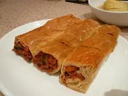 先來一個: 瑤柱鮮魚粥.不錯,有少許雞粉或味精吧.但也有少許已拆魚肉,一個小指甲大小,份量不多.再來了客蒜泥白肉(雲白肉).有點驚喜.薄薄的白肉片,看似肥肉滿盈,但咬在口中一點也不油不膩.爽且肉味恰到好處,加上那蒜味和醬油味道,配合得很.令我想起了昔日的老店子的味道,就跟這個差不多.吃罷,有點意猶未盡,想吃點煎炸的,也就加了一客炸春卷.嘩,春卷新鮮熱辣,正合我意.吠下去皮脆又香口,令人喜愛.內裡用料又別具一格,九成半以上是津白(黃牙白).其剩有些許東菇絲和雞肉粒.因為肉粒香嫩誘人,在向厨房小師傅求証下(因為他路過呵~),得知是用雞骴肉的呢,才會這樣香嫩囉.今天吃的運氣不錯呢