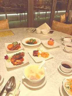 靚景配靚餸先叫完美!香煎大蝦外層微焦,咬開殼「咔嚓」響,蝦肉嫩到飙汁🦐;花膠雞腳湯熬得奶白,花膠入口即化,雞腳炆到一抿脫骨,膠質黏住唇齒,暖笠笠落肚超舒服。最驚喜係蠔皇扣六頭鮑魚,深栗色蠔汁掛住肉身,每一絲肌理都吸飽鮮味,配埋綿密魚翅同食,鮮到連碟汁都想刮乾淨。呢度將靚景同滋味揉得剛剛好,氛圍感直接拉滿。我哋去嗰日隔離枱就係慶祝結婚周年,甜絲絲嘅氛圍好感染人。唯一要記住早啲打電話訂位📞,尤其係臨窗位,絕對係想體面宴客、製造回憶嘅不二之選!