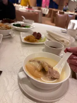 前段时间专门来北角看《鬼灭之刃》电影,这边不算熟悉,完全不知道该吃什么,就下载了 Openrice 翻点评,选中了这家能看海景的餐厅。和朋友两人点了明珠二小弄的套餐,体验挺好的!餐厅位置能直望维港,落地窗外就是开阔海景,看完电影来这儿放松超舒服。套餐菜品诚意满满,杏汁花胶白肺汤温润不腻,花胶软糯、猪肺炖得入味;豉油皇大虎虾鲜弹饱满,酱汁裹得均匀;四头鲍鱼 Q 弹厚实,吸足了蚝油香气。所有菜品口味在线、食材新鲜,关键价格特别公道,并没有比内地同类餐厅溢价很多。而且对两人这样人数少的客人很友好,不用凑单也能吃到丰富菜式。对不熟悉北角的人来说,是盲点不踩雷的好选择,推荐给来这边看电影或逛街的朋友