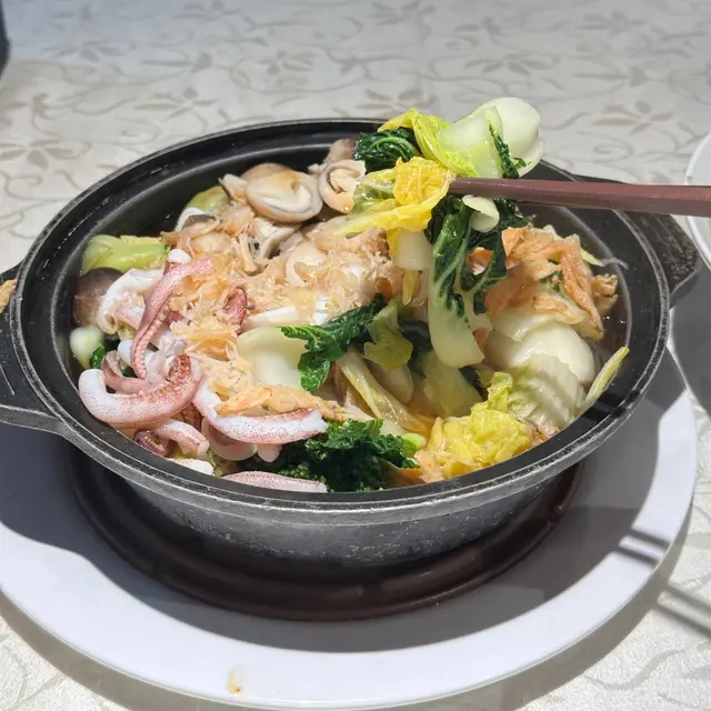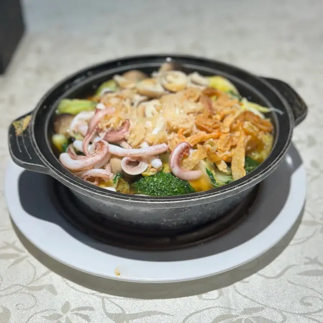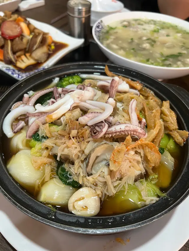 Visited this Chiu Chow resto with colleagues for farewell dinner. .We ordered the following dishes to share:-Braised Goose (HKD180)The goose was well-marinated but not very meaty and contained quite a lot of bones and fat. The dish had a bottom filled with smooth and soft tofu. -Porridge with Baby Oyster & Minced Pork (HKD128)The porridge had a fish soup base with minced pork. The rice grains were soft and not too sticky. The oyster did not have a fishy smell in general, and combined nicely with the soup, creating a sweet flavour. -Deep-fried Cuttlefish with Salted Egg Yolk (HKD160)Coated generously in salted egg yolk, the cuttlefish had an attractive golden yellow crispy skin. It was very savoury with a pleasantly chewy texture. -Mud Crab (HKD328)Accompanied by vermicelli, the mud crab was cooked with ginger and typhoon shelter-style sauce, giving it a more aromatic smell. -Tung Choi with XO Sauce in Stone Pot (HKD118)The tung choi absorbed the XO sauce thoroughly and had great wok hei. It was fresh and easy to bite into. -Deep-fried Crispy Baby Oyster Cake (HKD118)The oyster cake was filled with plump baby oysters, and dipping them in the fish sauce elevated the umami of the oysters. Its exterior was quite crunchy. -Braised Assorted Platter (+HKD8)To celebrate their sixth-year anniversary, the resto offered a promotion which allowed us to add HKD8 to order this dish after consuming a total of HKD300. The platter included goose intestines, goose kidneys, pork belly slices, pig intestines, cuttlefish, etc. Liked the elastic goose intestines the most. -Braised Bean Curd (HKD108)The bead curd was served with mushrooms and choi sum on the side. It didnt taste particularly memorable though. -Chinese Kale with XO Sauce in Stone Pot (HKD118)It was served piping hot and smelled good. Couldn't really recall its taste though. .The resto has a wall of pictures showcasing different celebrities who have visited them. It gets more and more ppl after 20:00. …查看更多