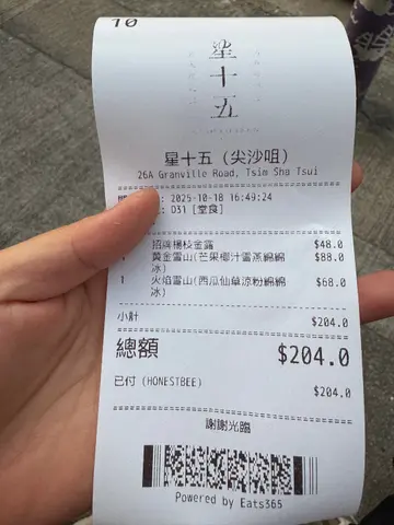 最近經過尖沙咀,天氣太熱,想食個甜品消消暑暑,俾我搵到呢間---🌟星十五🌟餐廳以黑白色為主調,環境乾淨整潔,座位唔算少,有別於一般嘅糖水小店。._.🫘 | 紅棗杞子雪燕燉桃膠 | 🫘揀咗款滋潤糖水,桃膠口感同雪燕好夾,滑滑地又有少少咬口,仲撘配咗甜甜地嘅紅棗杞子,甜度啱啱好。.🥭 | 黃金雪山(芒果椰汁雪燕綿綿冰)| 🥭咁熱嘅天氣好啱黎返碗綿綿冰,綿綿冰嘅選擇都有唔少,我就揀咗酸酸甜甜嘅芒果+椰子口味,芒果果肉粒配椰子味雪糕,味道非常香濃,食埋成碗綿綿冰,好消暑。.🥥 | 蓮子雲燕椰皇燉鮮奶 | 🥥椰皇系列選擇都係唔少,椰皇餐廳會有限供應,無曬椰皇就無,好好彩我當日下午仲食到,面頭舖滿曬配料,唔會太甜,味道啱啱好,食到最後嘅椰皇好嫩滑,好易就食到。._.