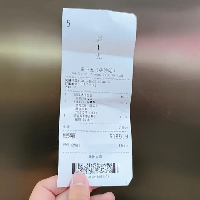 星十五 (尖沙咀) 網上訂座即賺Rice Dollars 網址: https://s.openrice.com/QrbS09LGC00 地址: 香港尖沙咀加連威老道26A號地舖 電話: +852 95189202