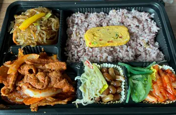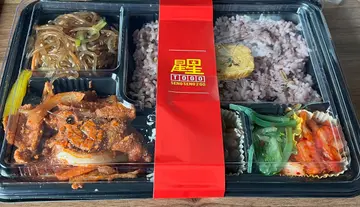 之前公司叫過外賣試到呢間星星覺得幾好食今次去開柯士甸就諗住堂食試下原來佢同一條街有堂食店同外賣店面見隔離堂食鋪啲餐點貴過外賣店20蚊再加一 又見到外賣店出面有枱櫈可以坐低食 天氣又唔熱 就決定外賣啦!烤辣醬豬肉便當一如既往嘅惹味🔥個便當睇落唔算好大 但根本唔會食得曬!配菜有一片蛋卷、泡菜、涼拌波菜、白蘿蔔同一樣唔知咩蔬菜😂主食有紫米飯同炒粉絲個飯幾好食!堂食店好似係冇紫米飯係配白飯的$58 有飯有菜有肉 營養均衡非常掂👍🏻見到姐姐執外賣執到冇停手👍🏻如果開喺中學區應該好受歡迎佢仲有牛雞魚、泡菜湯類等等好多選擇真係可以encore👍🏻…查看更多