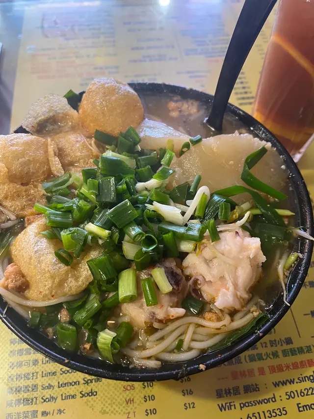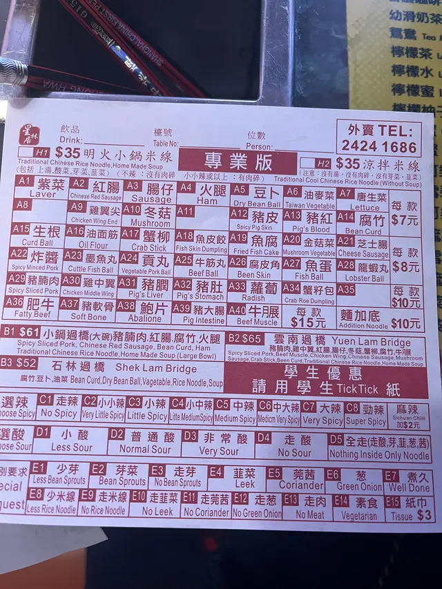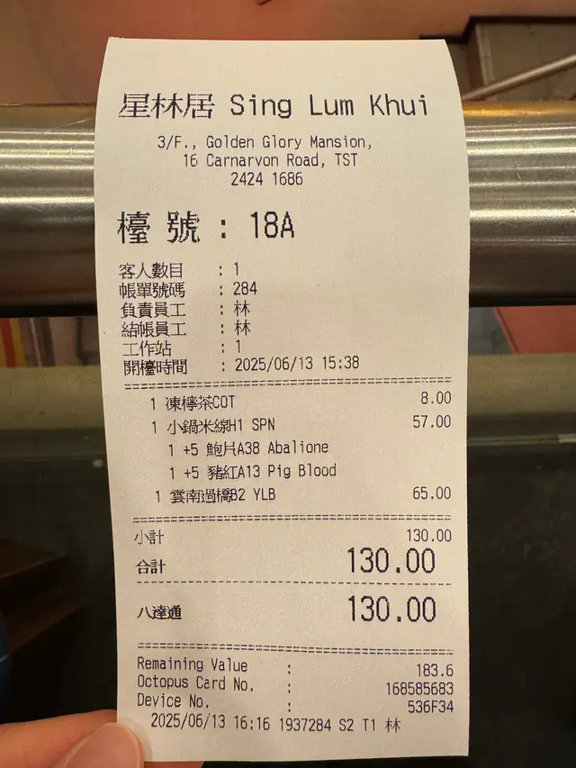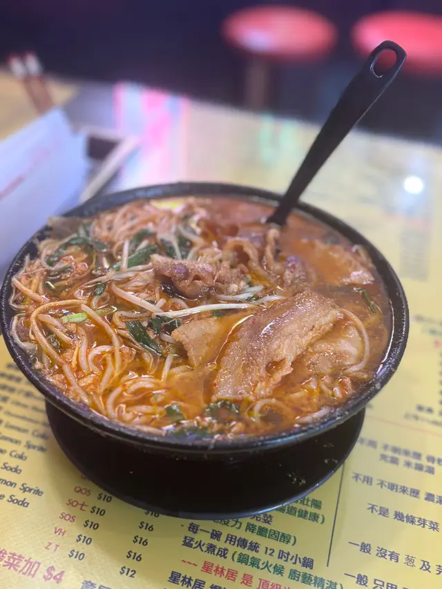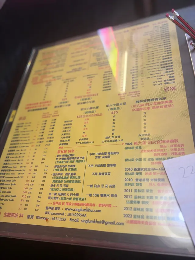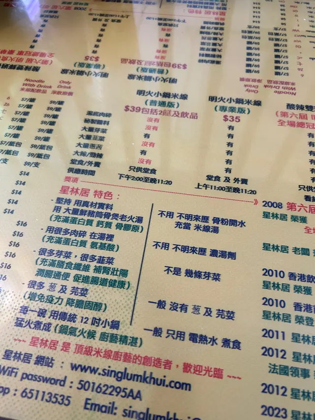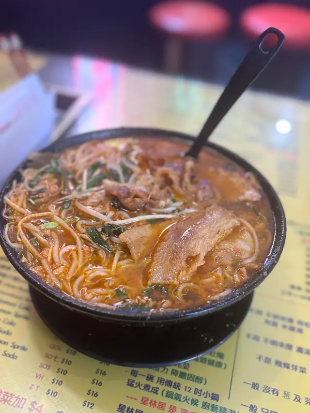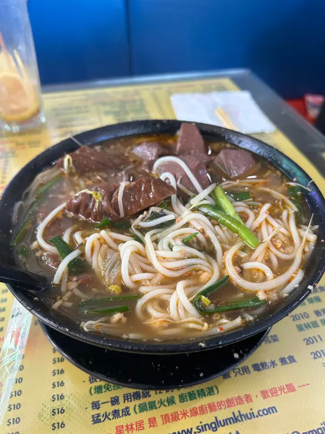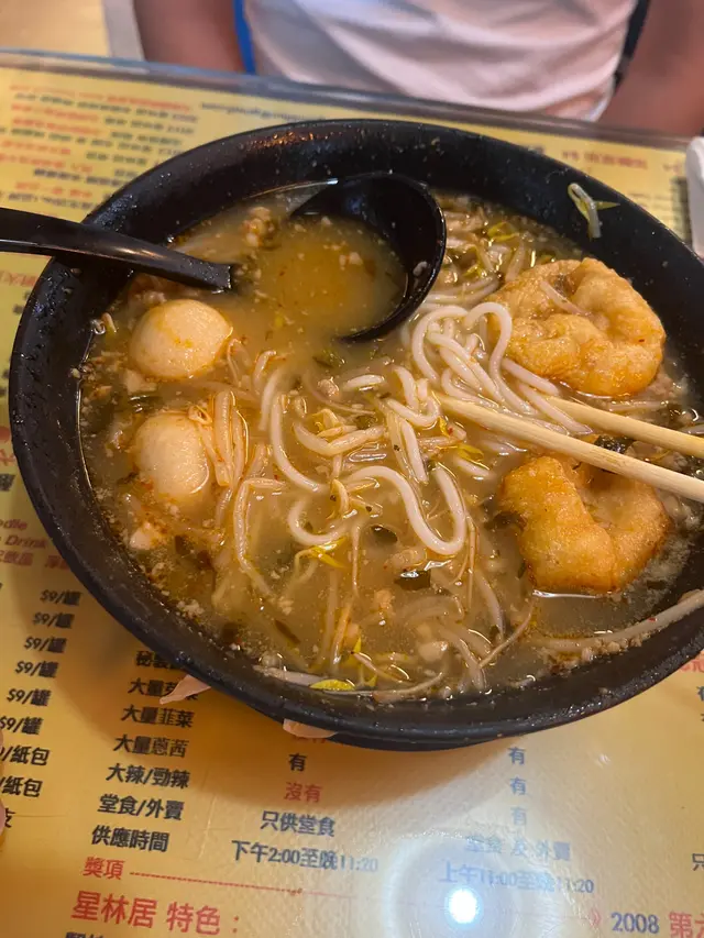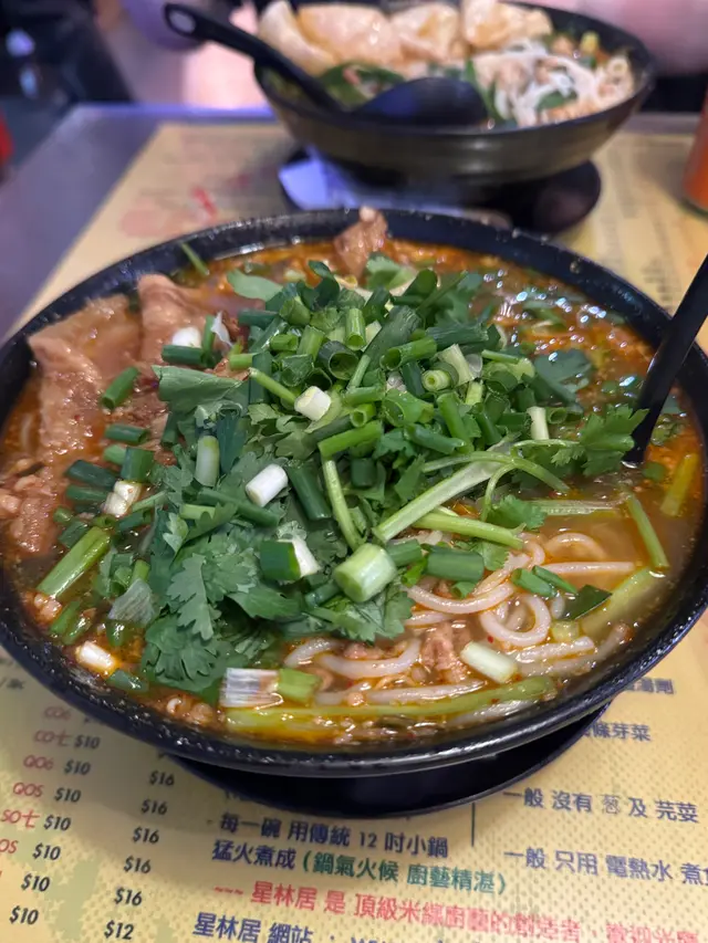 穿過彌敦道旁逼仄的樓梯,三樓的星林居用霓虹光管劃開兩個世界——紅底白字的「酸辣米線」燈箱下,兩碗沸騰著江湖氣的小鍋米線正冒著白煙。$124換來兩碗鋪滿配料的痛快,正。小鍋米線的靈魂在湯底,這兒的酸辣配方帶著市井的張揚。酸味並非單薄的醋精,而是醃製酸菜發酵出的渾厚底韻,辣勁則如漲潮層層疊加,麻油香氣像無形的手撩動食慾。首碗選配紫菜、肥牛、麵筋,吸飽湯汁的麵筋是隱藏主角,咬下時酸辣汁在齒間迸射;肥牛雖非頂級和牛,但油脂恰如其分地中和辣度,與紫菜的海洋氣息構成奇妙平衡。第二碗的豬肚與豬紅組合更見功力。豬肚燉得軟糯不失彈性,處理得毫無羶味;豬紅滑如凝脂,氣孔裡飽藏湯髓,與嫩滑米線形成雙重奏。特別要贊那勺肉碎,炸得金黃酥香,如星斗灑落湯河,每口都吃出驚喜。米線本身柔韌度剛好,在濃湯浸泡十分鐘仍保持筋骨。怕辣者可選小辣。環境是典型的港式樓上店,摺檯膠凳人聲鼎沸,牆上菜單密如武功秘籍。夥計執檯手腳利落,點餐後三分鐘即上菜,翻桌速度堪比茶餐廳。…查看更多