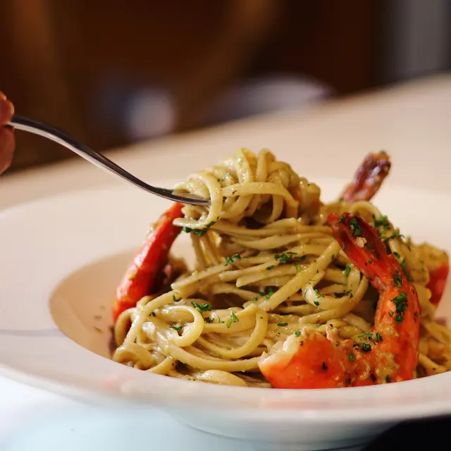 Pan-seared Prawn Linguine w/Avocado Cream Sauce