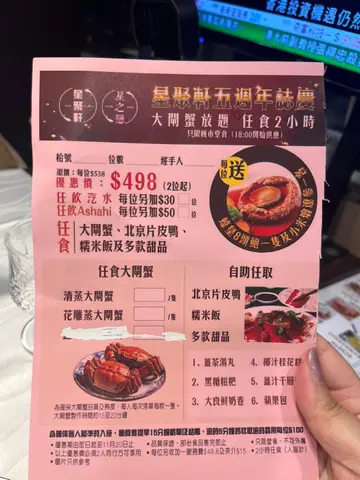 最近去咗位於佐敦既星聚軒,真係好開心!佢哋而家推出咗一個超值的大閘蟹放題,只需$498,就可以任食大閘蟹、片皮鴨、生炒糯米飯同埋各種甜品,真係好抵食啊!而且,每位客人仲會送一隻蠔皇8頭鮑同埋小米燴遼參,成件事好高級😋餐廳位置非常方便,距離佐敦地鐵站只係幾步路,地理位置一流🏙️ 入到去,環境都唔錯,裝修簡約而又有格調,令你喺食嘢嘅同時都可以享受到輕鬆嘅氣氛✨講返大閘蟹,佢哋提供清蒸同埋花雕兩種做法,咁樣可以滿足唔同口味嘅客人。我試咗清蒸,蟹肉鮮甜,而且非常爆膏,至於花雕蒸蟹,酒香四溢,食落去更加有層次,真係回味無窮🍶片皮鴨方面,皮脆肉嫩,真係好滿足!🥢 生炒糯米飯亦都唔可以錯過,飯粒粒分明,口感豐富,真係一試成主顧🍚最後,甜品方面,佢哋有薑汁湯圓,黑糖糍粑,薑汁千層糕,暖暖地食落去,仲有滋補作用,真係好開心😊 總括來講,星聚軒呢個大閘蟹放題實在值回票價,無論係食材質素定係服務態度都令人滿意👏 想食海鮮嘅朋友絕對唔可以錯過!下次我一定會再來!🌟…查看更多