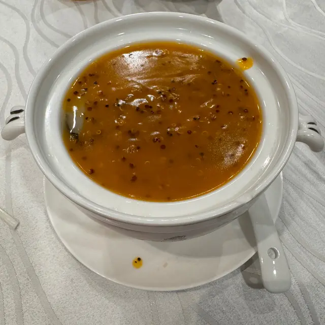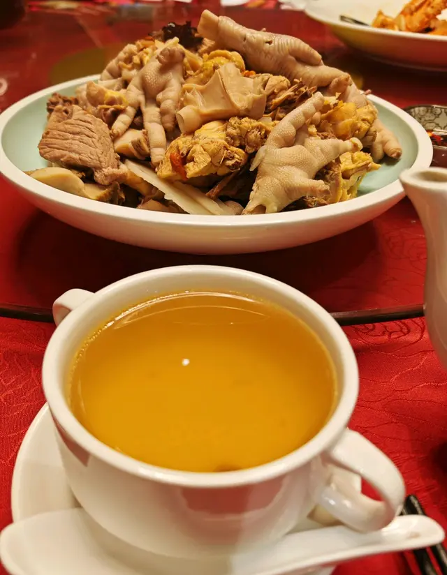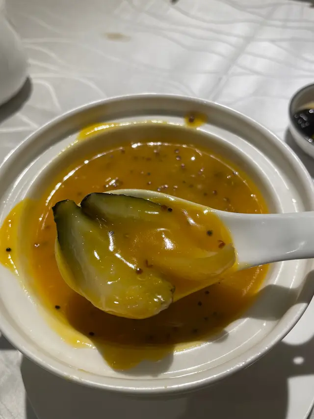 尖沙咀附近高楼林立,餐厅星布,这家也不例外。穿过全景玻璃电梯,高楼城景,来的比较早,店家在做服务培训,环境轻奢 招牌脆皮猪手🍖非常惊艳,酥皮,量大,肉质很酥嫩,咬下去非常脆。特别的点在于他的肥瘦相间,并且伴随着外表皮的脆皮,像小酥饼也比红烧肉更显得不腻 鲍鱼🧙‍♀上菜仙气飘飘🤣氛围感上来就是王炸,味道很糯很有嚼劲,品像超棒,经过细选的确实不一样,鲍鱼肉太饱满了,这才像香港该有的港派作风 鲜凤梨拔丝咕噜肉🥩每一份汁水都包裹在肉的鲜嫩上,拔丝这个词太具像了🤣真的很下饭,甜甜腻腻的。吃到后面有菠萝凤梨的感觉太棒了。 海南文昌鸡🍗朴素的品相但这正是海南文昌鸡该有的作风!味道入味入鲜,食材本身对我们来说才最重要,而且不咸呀,没有鸡胸肉那种柴柴的感觉,很嫩 星聚轩🏙佐敦庄仕伦敦广场八楼💰人均200-300查看更多