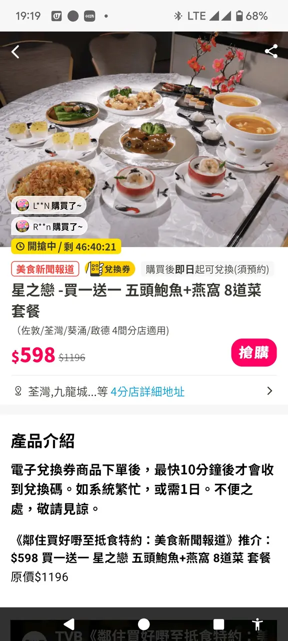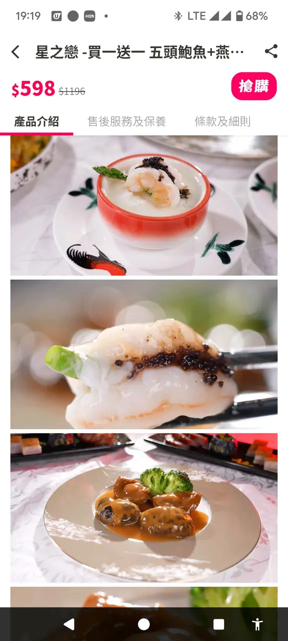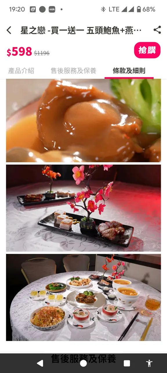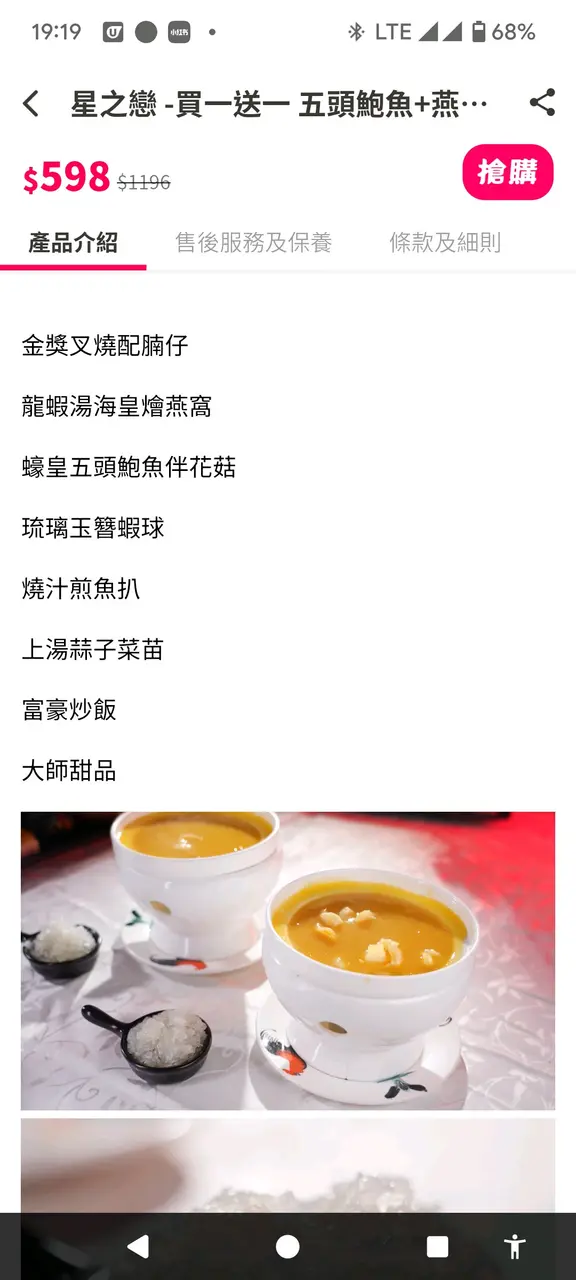 係鄰X買見買一送一八道菜套餐好似好抵,就買黎試下,都預咗廣告會同真實會唔同都打定7折,點知原來要得4折好多道菜都唔同咗1)龍蝦湯海皇燴燕窩變咗蝦粒,龍蝦消失咗,燕窩有少量2)金獎叉燒配腩仔變乳鴿,炸得偏乾3)琉璃玉簪蝦球變脆米炸蝦4)富貴炒飯5)燒汁煎魚扒6) 上湯蒜子菜苗7) 蠔皇五頭鮑伴花菇8)大師甜品紅豆沙,仲要唔熱本來諗住有蒸餸,點知全部都係炸咁滯,差啲食到喉嚨痛,兩位茶錢加一承惠 $750想試就要諗清楚查看更多