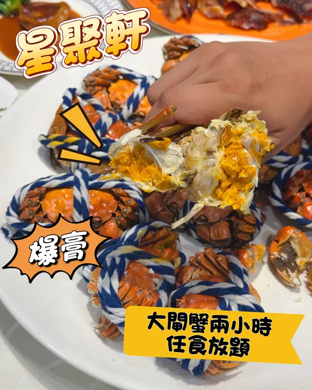 🦀✨【蟹迷天堂!佐敦星聚軒任食放題登場】✨🦀秋天唔食蟹,等於白過!星聚軒推出兩小時任食大閘蟹放題,蟹膏爆滿、鮮味撲鼻,食到唔想停😝🎁 入座即送:・蠔皇8頭鮑魚一隻(鮮嫩入味,口感厚實)・小米燴遼參一客(滑溜香濃,養生又滋補)🦀 大閘蟹三重奏:🔸 清蒸 — 原汁原味,蟹膏濃郁黏口🔸 花雕 — 酒香撲鼻,鮮甜中帶微醉🔸 鹽油焗 — 香脆惹味,蟹香升級🆙自取任食🦆 北京片皮鴨(皮脆肉嫩,甜醬香濃)🍚 生炒糯米飯(粒粒分明,臘味香氣撲鼻)🍮 多款甜品(馬拉糕、紅棗糕等,甜而不膩)⏰ 兩小時任食,款式多到唔夠時間食晒!查看更多