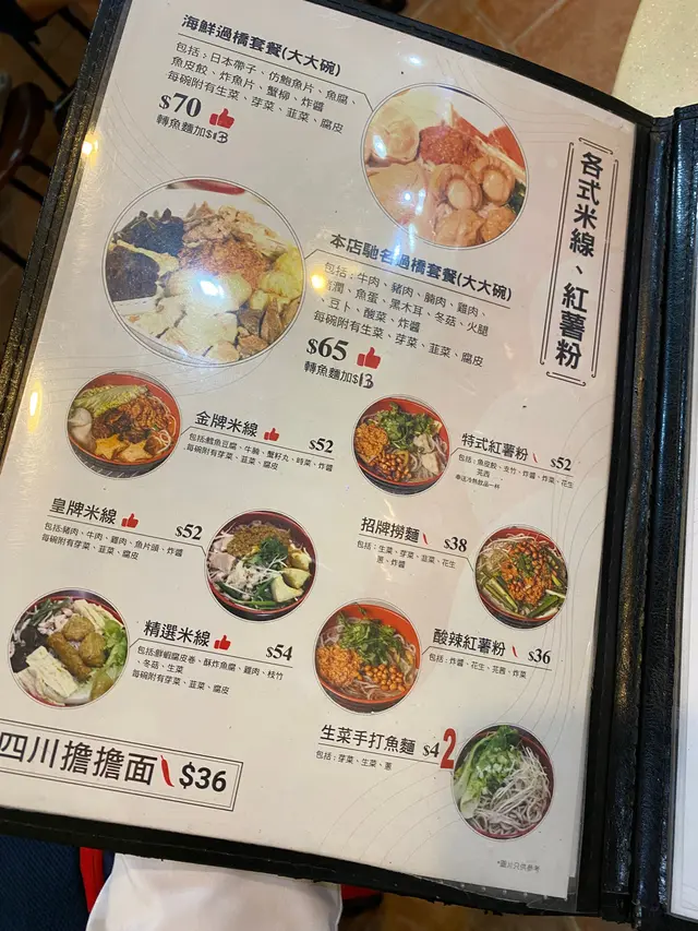 午餐叫了三餸米粉,豬腸、菜、豬腩肉。湯要左酸辣,最小辣。一共5 6元。湯係偏咸,好重味,這個理解,因為佢係雲南米線,還可以接受。豬腸味道可以,肥瘦適中。但啲九菜黃哂,一啲都吾綠,應該廚房係一早淥定,客人叫嘅時候,就加落個碗度。去既時候得幾枱人,人流吾多,如果啲蔬菜一早淥定,就吾好味,賣相差!但朂差嘅係啲豬腩肉,真係咸到苦!完全食唔到。佢哋應該係用雪藏豬腩肉,再用重塩閹左一段時間,真係好差!建議老闆應該自己先試食,才供客人食用。…查看更多
