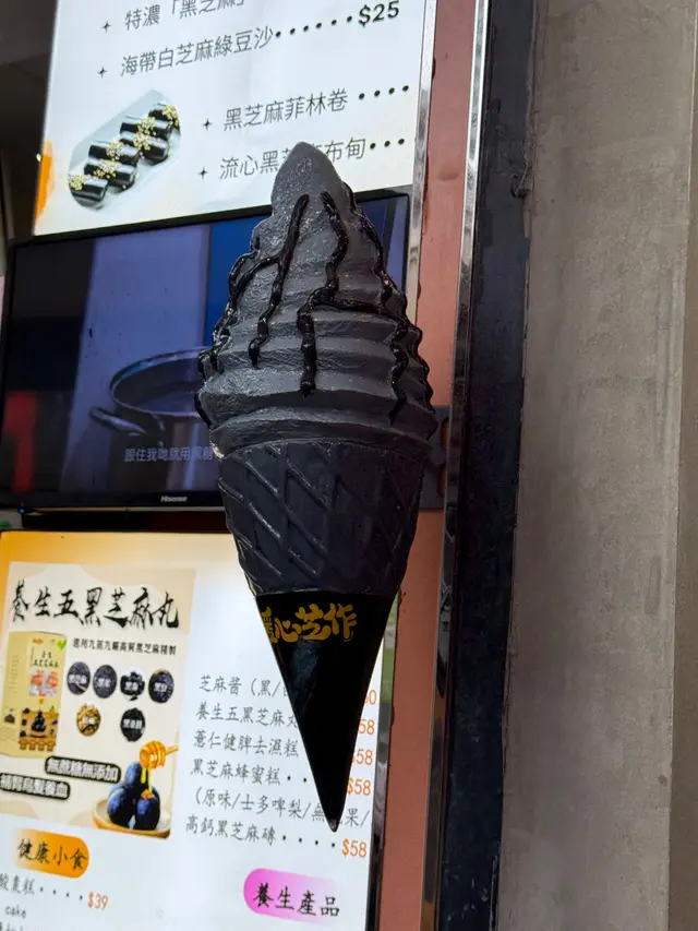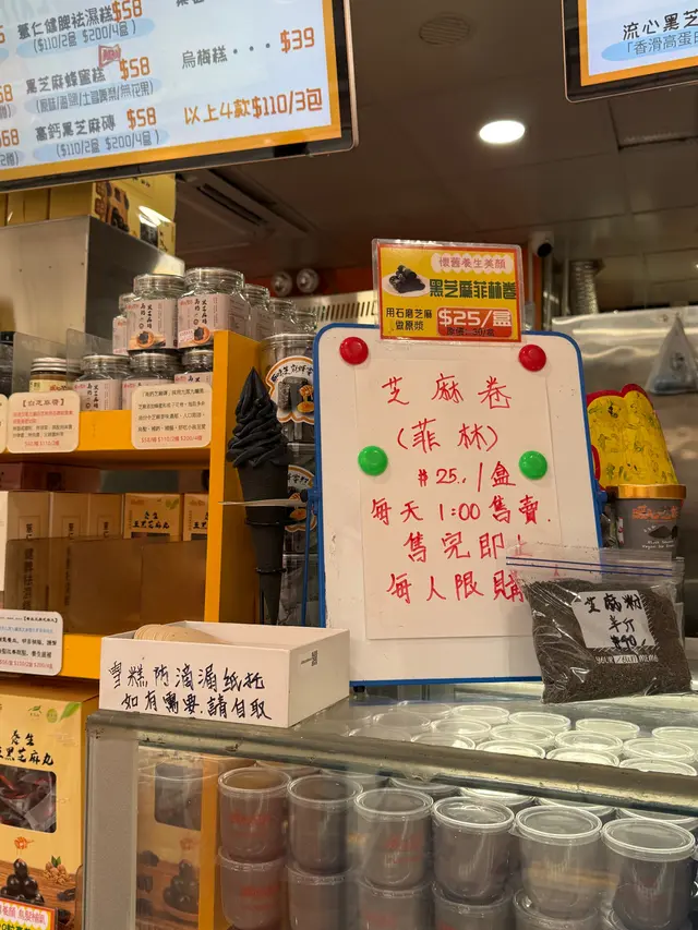 是日打風下午落波所以唔係咁多人排隊,幸運地只是等了一等買到了雪糕、傳聞熱賣的"菲林"和芝麻糊。先講雪糕,只係雪糕上的醬有芝麻味,雪糕就無乜味喇,成為$28;而菲林就唔夠芝麻味,比較遜色,成為$25;至於芝麻糊雖然香但好鬼甜,成為$30。整體來說不過不失啦! 唔可以講絕對好食,如果要排上15分鐘以上就唔係好值。還有,店員態度麻麻地。