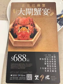 一個高質嘅大閘蟹盛宴,其實係要所有菜式都高質先得。位於鰂魚涌嘅”望月樓”,本來已經係相當高質。未上到嚟嘉里中心二樓,已經覺得周圍環境高級、典雅。內裏更加有現代化嘅奢華感。而家呢度做緊一個七道菜大閘蟹宴,每位$688。清蒸大閘蟹 (五兩、蟹乸)鮮拆蟹粉小籠包金瑤海味羹蟹粉扒時蔬蟹粉炒飯十年陳皮紅豆沙生磨芝麻卷就咁睇字未必睇得出呢個餐有幾好食。首先佢隻蟹係相當大隻,入邊嘅蟹膏好多,淨係食一隻已經好滿足,大閘蟹唔使多,最緊要夠大隻多蟹膏!佢嘅蟹粉小籠包充滿蟹粉味同肉湯,食得出佢鮮拆嘅味道。金瑤海味羹湯味香濃,一路食一路有唔同嘅海味,唔落任何胡椒同醋味亦非常美味。蟹粉扒時蔬,當中嘅蟹肉仲多過菜,令人食得非常滋味。至於蟹粉炒飯,亦唔可以睇少。乾身,有鑊氣,味道十足,亦好香口,差唔多一個炒飯嘅優點佢都有齊。令我驚訝嘅係紅豆沙,因為我本來唔係好食紅豆沙,但係佢嘅陳皮味真係好突出,絕對唔係一般茶樓貨色。最後唔少得佢嘅芝麻卷,香甜淡雅,充滿芝麻味。另外要讚佢提供咗一個薑味異常地強嘅薑茶,絕對可以令餐飯提升。呢度每一道菜都做得精緻,唔係求其搬一個大閘蟹餐出嚟就算,可以食得出佢嘅味道同用料都係經過精心調配,對得住佢嘅價錢同呢度高雅嘅環境。…查看更多