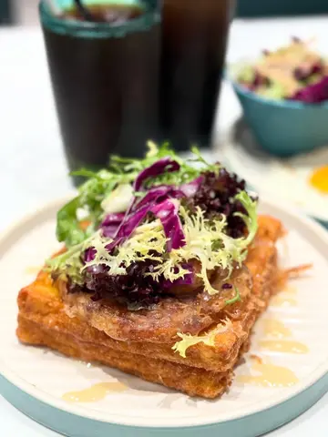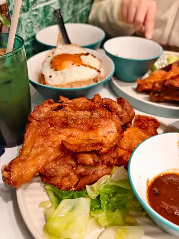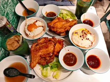 ⭐點了兩份招牌: 生炸雞腿皇煎蛋飯(沙嗲汁)➕一杯咖啡➕額外的麻辣醬 上飯前送了一碗湯 感覺湯好好喝!喝完了!看到🍗雞腿的時候有點驚訝確實好大一只啊,炸的挺香脆,味道就還可以吧,中規中矩,主要瞬間覺得也沒那麽驚艷,不像網上說的這麽好吃,😳話說😅吃蔬菜的時候太陽蛋飯還不錯,至於選的醬料,我們都覺得沙嗲汁有點甜膩歪,粘了兩口都吃不下了,還是配它家自製的麻辣醬好吃,感覺雞腿➕麻辣醬好吃度直線上升,本來覺得吃不下,結果有這麻辣醬,一下炫完一大半,分量確實很多,我們都沒吃完,還剩三分之一的雞腿,半碗飯……查看更多