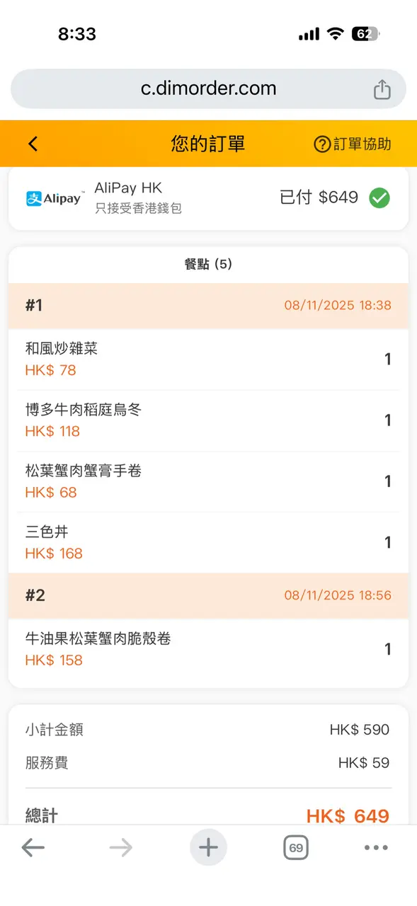 大圍居酒屋 檸兒等級42025-10-14394 瀏覽 關注 木子居酒屋,係大圍區幾出名嘅居酒屋,呢晚喺大圍唔知食咩,就過嚟試吓,冇訂位,都有得食,坐吧枱位,入面都幾多人食軟殼蟹天婦羅 $88軟殼蟹唔係好大隻,不過入面都幾多肉,幾肥,炸粉唔算厚,都幾脆刺身盛合6点 $428刺身厚度適中,還算新鮮,帶子幾鮮甜免治雞肉棒 $38雞肉太甜,口感有啲太淋活章魚足刺身 $98很薄,冇乜味,側邊幾粒吸管就甜甜地牛油果松葉蟹肉脆殼卷 $158牛油果新鮮,食到松葉蟹肉鮮甜,卷物偏細三色丼 $168呑拿魚蓉幾creamy,三文魚子有啲腥,海膽尚算鮮甜價錢不便宜,份量少,食完都係餓…查看更多+ 3以上食評乃用戶個人意見 , 並不代表OpenRice之觀點。讚好分享大圍居酒屋 木子居酒屋 https://s.openrice.com/QrbT0kSfU00檢舉 張貼 評分3味道3環境3服務4衛生3抵食推介美食軟殼蟹天婦羅$88軟殼蟹天婦羅$88用餐日期2025-08-14用餐途徑堂食人均消費$550 (晚餐)