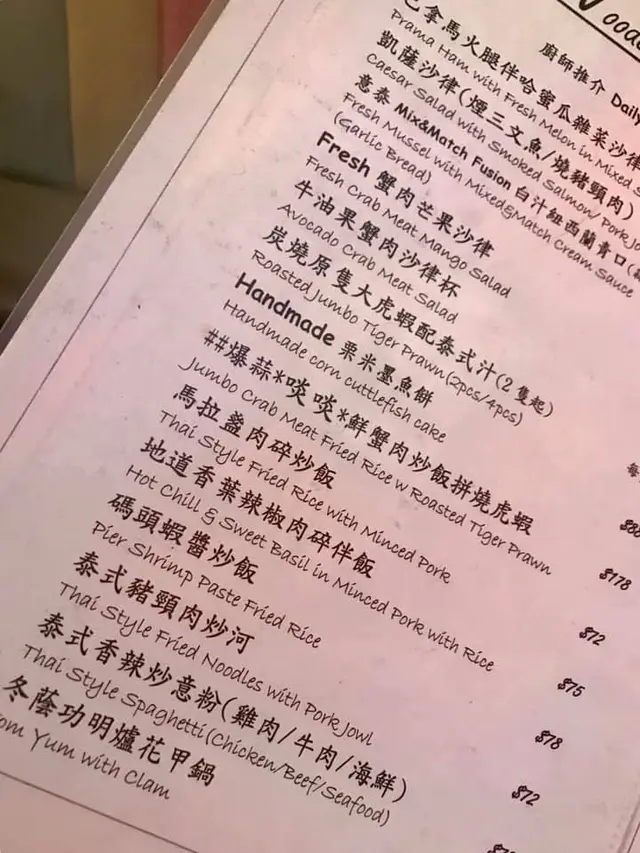 之前都來食過一次,當時沒有拍下食物照,上次是點了招牌菠蘿炒飯配虎蝦(HKD158) 和 泰北沙嗲串燒拼盤(HKD128) ,味道是不錯的,印象也不錯的。這是第二次光顧,就點了炒飯,味道微辣,就是普通炒飯一樣。本來是點蒜蓉鮮蜆肉意粉,但是送錯餐,送了這碟不知道是什麼的菜,然後告訴給待應。最後就給回正確的食物,但明顯是用之前個碟再加回蜆肉給我們,汁是加稀左,味道超怪原本是抱著期待感來吃,沒想到會失望離開…查看更多