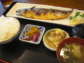 。叉燒同樣有兩大片,不過配料就跟上面味噌拉麵唔一樣,少咗粟米粒,但整體份量依然十足,一樣咁出色好食。燒鯖魚定食 $85 :)太太特別鍾情於日本嘅燒魚,燒三文魚、燒銀雪魚……等等,見有燒鯖魚定食,佢諗都唔使諗就揀定。一份燒鯖魚定食,已包括味噌湯、一小碟醃物、一小碟煮物及一大碗白飯。醃物同煮物賣相都好普通,有啲行貨嘅感覺:(,以一貫日本人做事嘅認真及精益求精,我就覺得依兩樣嘢唔合格喇。反觀條鯖魚,賣相就好好多,上枱已聞到燒魚香,不過,唔好睇相以為係原條燒,其實得半邊,但已去咗魚骨,所以食起上嚟都好方便嘅,只係略嫌份量少咗啲。雖然只係簡單嘅鹽燒,都已好好食