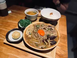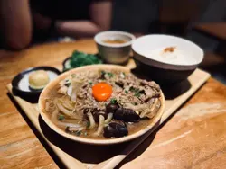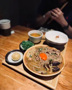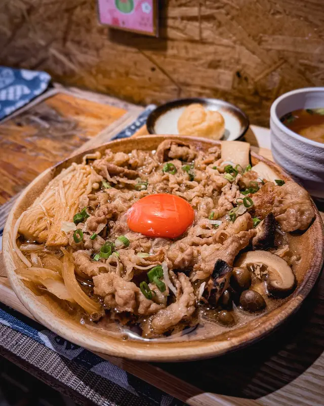 牛肉寿喜焼配和式定食溫泉蛋非常吸睛,呈金黃色,牛肉份量多,醬汁調得啱啱好。圍住牛肉有滿滿蔬菜伴碟,有豆腐,金菇,洋蔥。真係可以送幾碗飯。