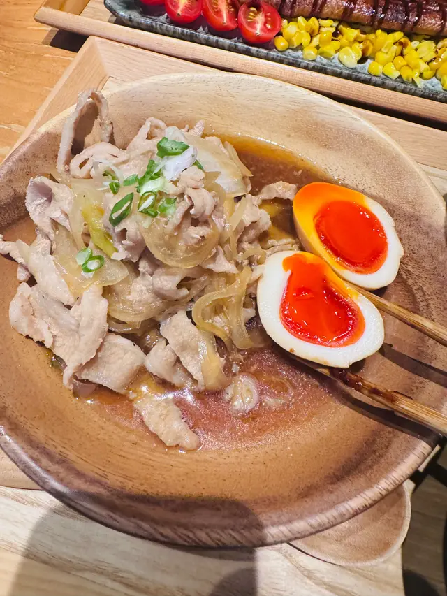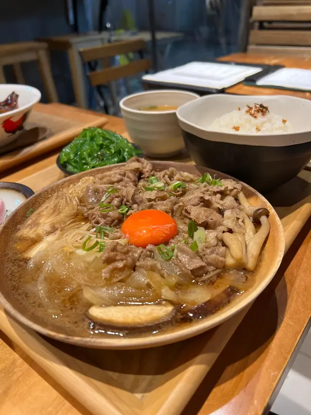 牛肉寿喜焼配和式定食溫泉蛋非常吸睛,呈金黃色,牛肉份量多,醬汁調得啱啱好。圍住牛肉有滿滿蔬菜伴碟,有豆腐,金菇,洋蔥。真係可以送幾碗飯。