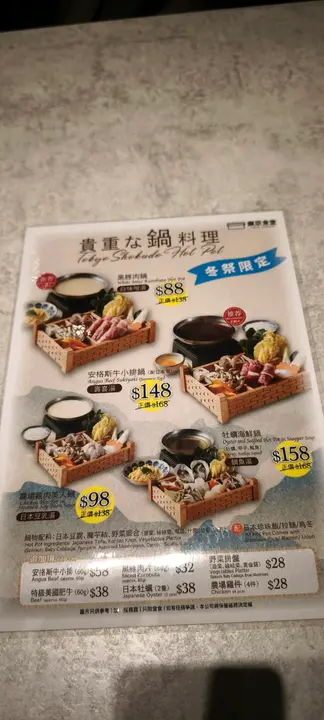 今天和家人來到屯門V City 吃午餐,這間餐廳是新開張的,而且看見冬日限定的火鍋好像挺吸引,於是我們便來這裡吃飯。黑豚肉鍋:黑豚肉鍋本身已指定了味噌湯底,只能選配烏冬/拉麵/白飯而已。而我們便選了拉麵,拉麵的質感幾煙韌的,而且滲透了濃濃的湯汁,味道相當不錯。而豚肉則不會太肥,再配上其他蔬菜,份量是相當足夠的。雞肉美人鍋:雞肉鍋則指定了豆乳湯,而這份我們則選了烏冬,烏冬的掛汁能力更勝拉麵,每一口烏冬都完美滲透了豆乳的香氣,至於雞肉亦鮮嫩多汁,我們都認為這兩款火鍋性價比是最高的。天婦羅抺茶蕎麥麵:天婦羅是即叫即炸的, 所以外皮十分香脆可口,口感亦一點也不油膩,美中不足是蕎麥麵沒有什麼抺茶味,而且即使沾了醬汁,依然都沒有什麼味道,淡而無味的,而且這份要$138,性價比低很多。自選便當:另外我們亦點了一份自選便當,光看賣相已失色很多了,味道則不過不失,雖然這個餐只是$118,而且亦贈送了飲品,但是卻十分甜,完全難而入口,建議大家都是點火鍋算了。牡蠣餃子:牡蠣的味道並不算濃郁,吃的時候其實和豬肉餃子沒有什麼分別,大家可以不用嚐試。價錢方面,4個人連加一之後$520,正常香港價錢。總結來說,冬日限定的火鍋性價比最高,建議大家這個冬天盡快來嚐試一下,至於其他主菜則味道正常,希望遲些會更新不同主菜。…查看更多