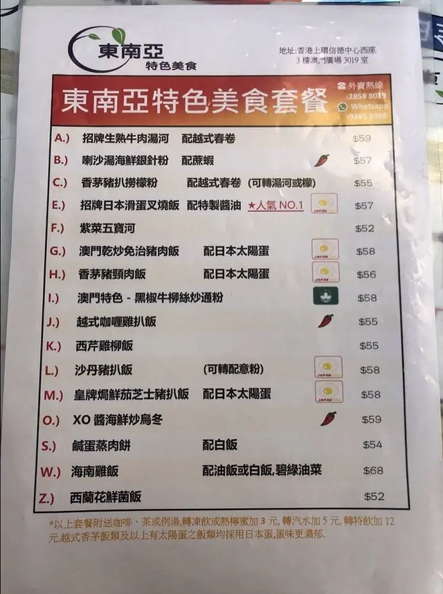 呢間位於上環信德中心中澳門廣場唔顯眼既東南亞餐廳。 唔好睇佢唔顯眼,野食份量足夠,味道偏少濃。今次叫左全日特餐,沙嗲牛肉出前一丁配牛油厚多士,火腿奄列配飲品。先唔講味道,就咁服務已經一流,佢本身幫我落單,問我要唔要辣椒油,我話我自己網上落單亦可以減1蚊。我忘記係備註寫辣椒油,估唔到店員記得幫我攞埋辣椒油。而且話驚我路途遙遠,怕倒寫啲湯汁,特登包好哂,店員十分貼心。美食方面,意想不到沙嗲牛肉個汁咁濃,份量又大又多,起碼7到8塊以上。湯汁分開幾次落,等啲沙嗲汁同湯底慢慢融落麵到。最後加啲辣椒油,同時食到沙嗲濃香亦油辣椒油香。火腿奄列都係份量十足。以上環黎講,50幾蚊有啲咁既份量,服務同味道質素好,好值得試…查看更多