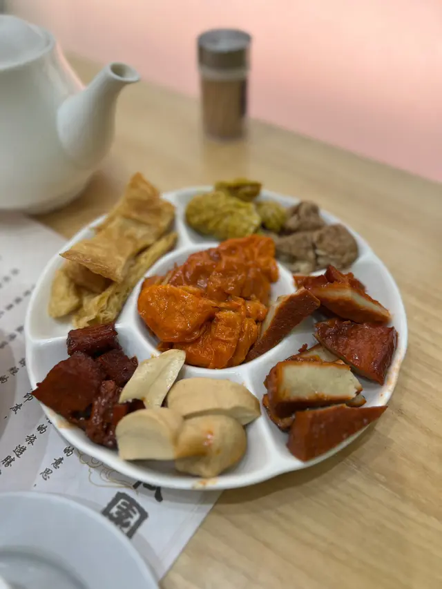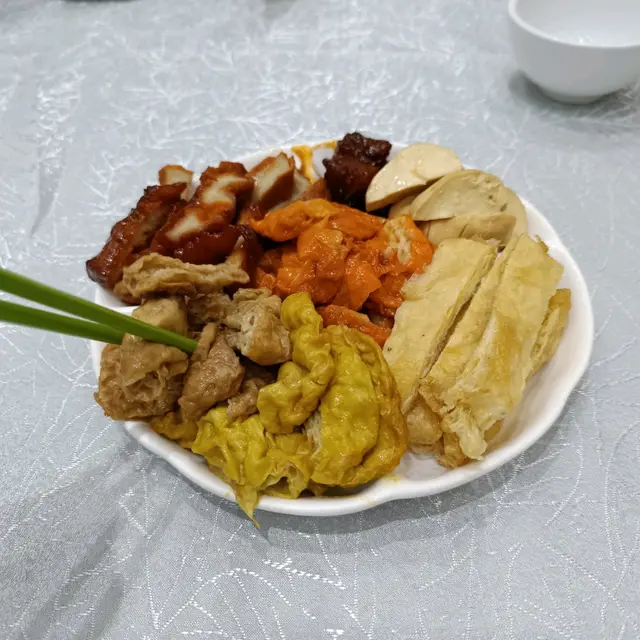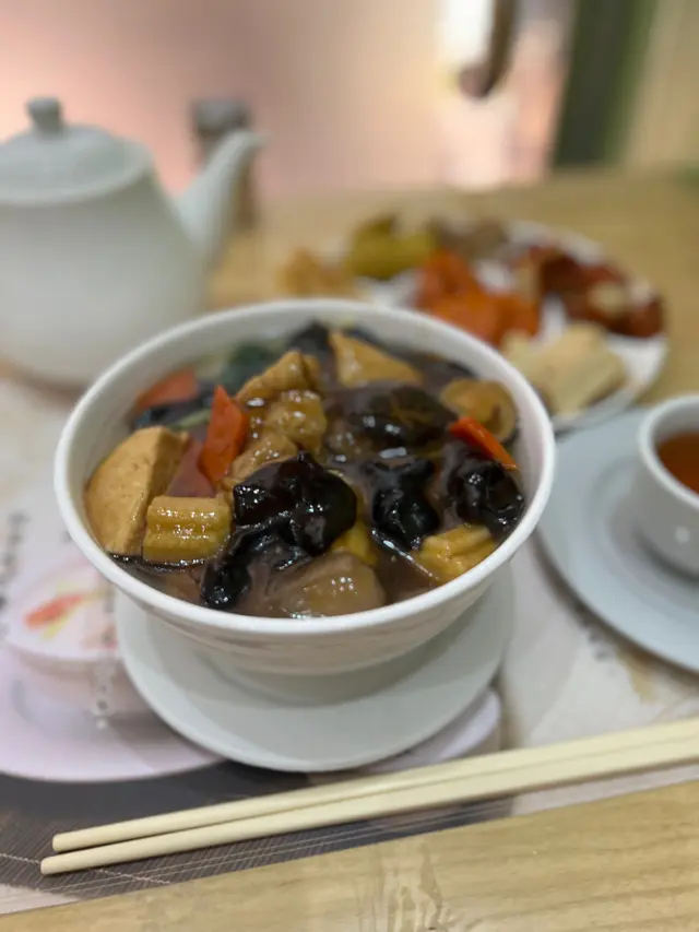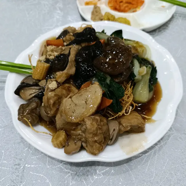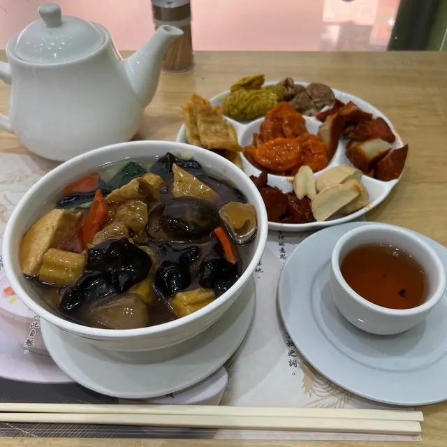 When I was still a secondary school student, I usually went to the bus stop in front of this restaurant to take the bus home. Just knowing that it is a veggie restaurant, and I was not particularly interested in the cuisine, I did not pay any attention then. I was surprised to know later that they had such a long history, opening in 1905. Today, we came to Wanchai to try it out.Even though it was already 1:30pm, the restaurant was packed, but the staff helped to arrange a table for us. Having renovated, it has a neat ambience, with bright lighting, and some Chinese calligraphy decorating the walls.Starting with the most common, Buddha’s Vegetarian Pot Stewed Delight 佛門齋滷味 ($72 for small), it is an assorted mix of different delicacies, using wheat gluten to make vegetarian char siu, duck kidney, chicken, plus the different flavors of sweet and sour, curry, and oyster sauce gluten. Apart from the sweet and sour gluten, which is quite nice, the rest are only mediocre. We also order two dishes, including Fried Pipa Bean Curd 琵琶豆腐 ($88) and Braised Monkey’s Head Mushroom with Broccoli 鮮猴頭菇扒西蘭花 ($90). The pipa bean curd is quite nice, with the deep-fried minced bean curd balls soaking up the oyster sauce which is quite nice, and there are also some choi sum on the side for complement.The monkey’s head mushroom has a good texture, and no wonder many people would use this to replace meat as it has certain similarities in taste. The chef cooked this together with some straw mushroom and broccoli, but the broccoli unfortunately has not been soaked and cleaned well, and we did find a worm which apparently put us off.To go with the dishes, we have Congee with Sweet Corn and Diced Mushroom 粟米菇粒粥 ($55). The portion is enough for two people, with the congee having a nice cotton texture, with the sweet corn and diced mushroom giving a bit of crunchy bite and fragrance.Service is decent, but we can at the same time see a neighborhood ambience from the chats and dialogues between the staff and customers. The bill on the day was $329 and while the food is not particularly impressive, it is an anchor and should be cherished as an old HK establishment.…查看更多