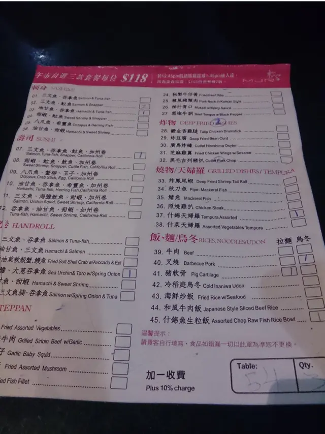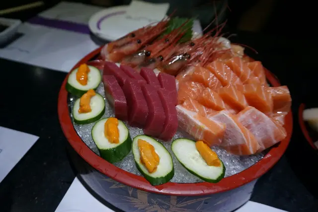 週一小弟同家人一行四位去食5:30-7:45的放題,因為平啲!我地一入去不需等就入座卡位,可能人少食的關係!坐下就點我喜愛的三文魚(全是魚腩~正!),海膽(今次無苦味,好甜!上次有苦味),青口(熱辣辣,仲有芝士同粟米粒),牛柳粒(無韌),羊架(鬆軟),牛尾(好滑),天婦羅(普普通通),炒雜菜(真是麻麻),飲品叫了杯熱柑桔蜜(開胃),最後是甜品雪糕(居然夾雜着碎冰,且味道一般)總括來說:除了雪糕,其他都算不錯,比上次好食左!
