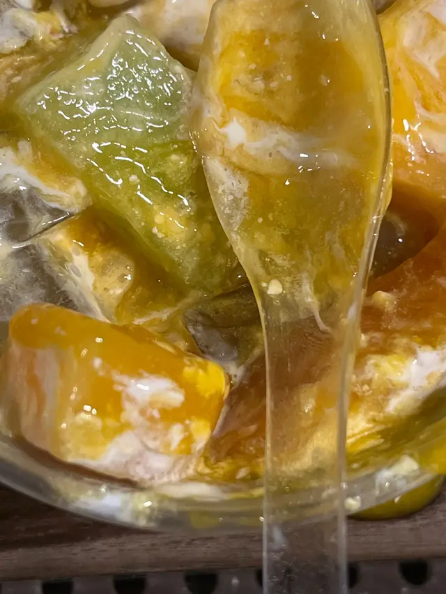將雜果芋圓仙草凍發揮到世界級水準,啲紅豆擺左雪櫃解凍再放返入雪櫃重覆幾日果陣雪櫃味;啲雜果有蜜瓜(淋得黎冇味),哈蜜瓜(爽得黎又唔知放左雪櫃幾多日),西瓜(冇味得黎唔甜唔爽有啲硬,芒果(淋既但比起其他已經叫大鑊全勝),珍珠(放耐左果種外散內實既質感),芋圓最有誠意暖既可惜浸左係薑糖水道唔知幾耐但可能係特色,啲仙草質地硬硬地好似啫喱一咬散修修個感覺好嘔心;食完好想嘔🤮好似將所有就黎要倒落垃圾桶既野放入口查看更多