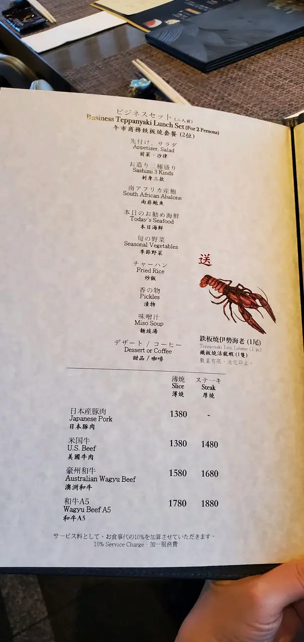 之前月生日朋友請食飯請咗我呢一間板神食,早兩個禮拜book既枱,好彩仲有吧檯位餐廳而家做緊感謝祭$ 398蚊一個人鐵板燒14品, 唔同部位要再另外加💴我同我朋友分別嗌咗唔同set🐮set1 澳洲和牛厚燒($448) 🐮set 2 和牛A5厚燒 ($648 )再加咗支細清酒 同正常鐵板燒餐廳一樣 佢會將啲材料放喺你面前畀你影相,我哋兩個人所以佢就將兩個人嘅份量一齊放落同一隻碟度海鲜有蠔有鮑魚同埋蝦另外有少少前菜同有個甜品 前菜有幾塊刺身同一碟沙律,加小拌菜。之後係煎蠔味道都正常。食完之後就上煎鮑魚,鮑魚煎得唔錯火候控制得幾好。另外佢係用咗啲香草牛油去煎 ,所以調味嚟講都唔單調。再之後煎埋隻蝦,呢個都正正常常之後有啲🥬烤蔬菜用來間場,仲有個麵豉湯 再之後就入正題 :🐮澳洲和牛同A5厚燒 個牛佢好似會問你想要幾多成熟,但係推薦好似係五成,所以我哋兩款都嗌咗五成熟。個師傅知我哋點咗兩款餐好好人問我哋會唔會想人一半,我哋話ok於是左於是乎佢將兩塊牛分成八件再畀我哋每人四件四件 。兩款牛食落都好好味 ,A5嗰隻油脂感重少少入口即溶,澳洲嗰隻就肉味重啲稍為有少少咬口,但係都好好味。如果約兩個人嚟食我都推薦一人叫一款唔同嘅,我見隔離枱嗌咗薄燒係一塊薄牛肉包住啲蔥花,跟住一人有兩塊定三塊,對比起來講一定係嗌厚燒正好多 。食完牛之後就係一個和🍚牛炒飯,和牛炒飯炒得好香 ,粒粒分明口感幾好,同埋份量都足。之後甜品有🍡蕨餅同埋焦糖煎多士:蕨餅軟糯唔黐牙,個多士香脆易入口,用嚟埋尾好唔錯。 我哋叫呢款🍶清酒 ($250 300ml) 比較輕身清爽,少少甜好易入口,用來配鐵板燒一流,推薦大家都嗌細細支可以解腻 。坐吧枱其實都幾過癮,有得食有得睇,同埋今次睇得出我哋呢個師傅手勢唔錯 呢間餐廳整體嚟講幾好,性價比唔錯,食物質素都好好,環境氣氛都冇咩可以彈,唯獨是佢人手唔係好夠有時叫佢加茶叫咗幾輪先有人過嚟,可能係因為我星期六晚過嚟,睇得出佢所有枱都坐滿 。…查看更多