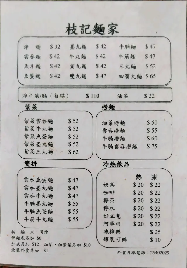#枝記麵家 喺半山區有一間超過50年嘅老店麵家,西營盤地鐵站般咸道出口行過去好快到,兩三年前曾經食過牛腩河,當時覺得普普通通。時間幾年今次再去幫襯,價錢都幾貴,下午茶三點開始,$52一碗麵飲品,凍飲再加兩蚊。增加時段一碗麵$42起,唔算平。今次想試下佢嘅牛筋麵,牛筋都有五六件,都好入味好淋,比幾年前食嘅牛腩還要好,當時覺得牛腩有啲實。湯底亦都好夠味,唔會沖淡咗,今次過得非常唔錯。老闆話牛筋係炆煮,返好多時間同功夫,或者因為咁樣所以會較淋,而家好多都係白烚,可能比較爽身,兩種唔同做法。凍檸茶就似家庭式沖制,茶色雖然救心但查香味不夠,下午茶時段加兩蚊還可以,正價時段散叫廿幾蚊就無謂。值得一提係營業時間到下晝四點幾,我因為四點後先去到,所以又阻住佢哋收工😅整體嚟講呢個價錢食到傳統手藝我覺得還可以啦,只要覺得好食就唔貴😋枝記麵家半山巴丙頓道1號地下M4A號舖