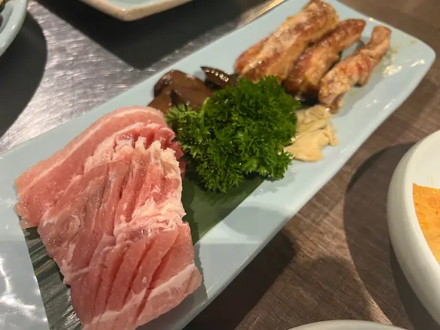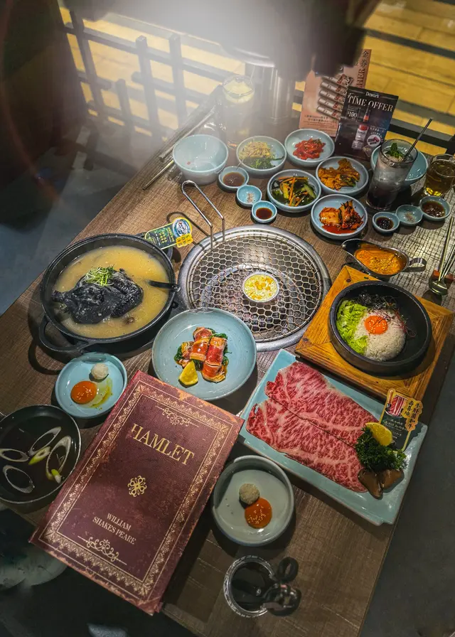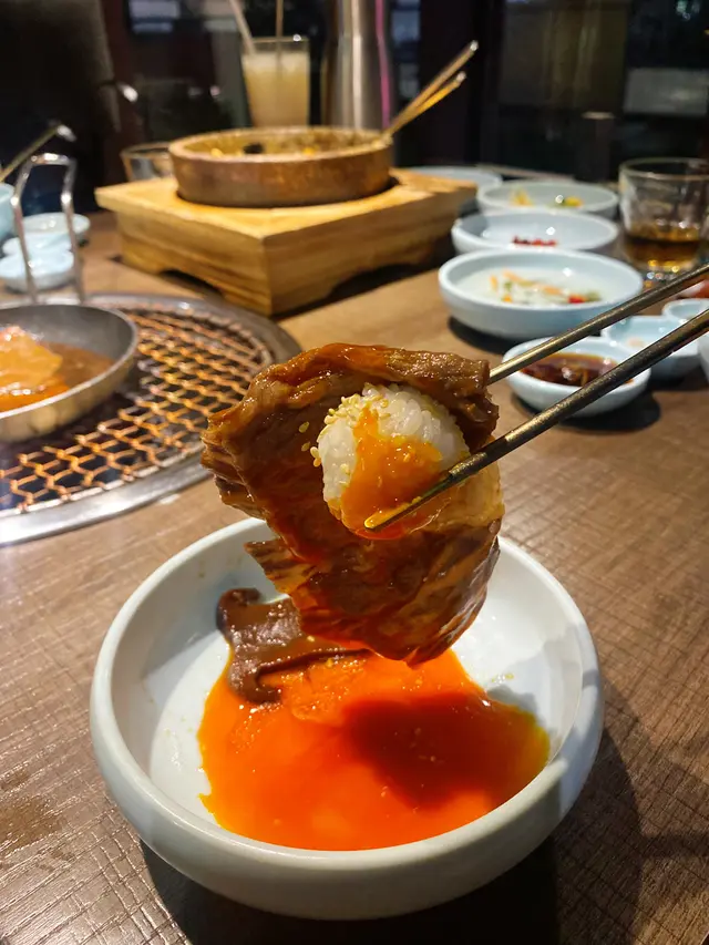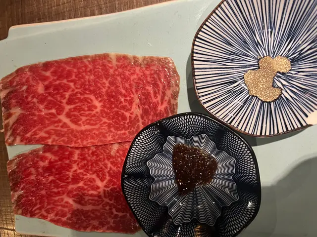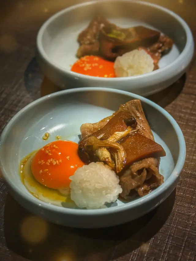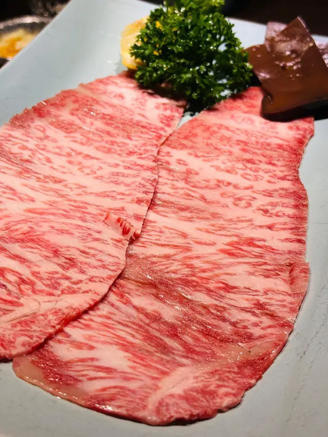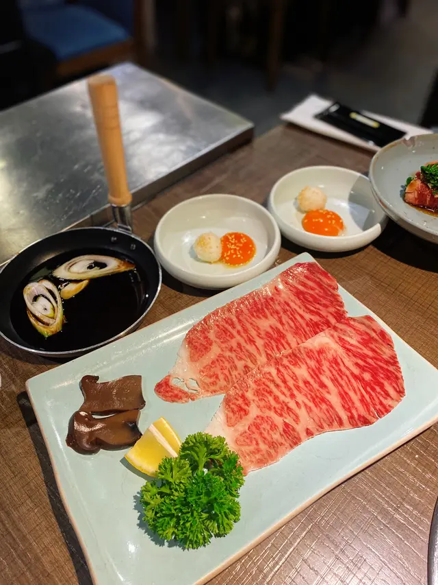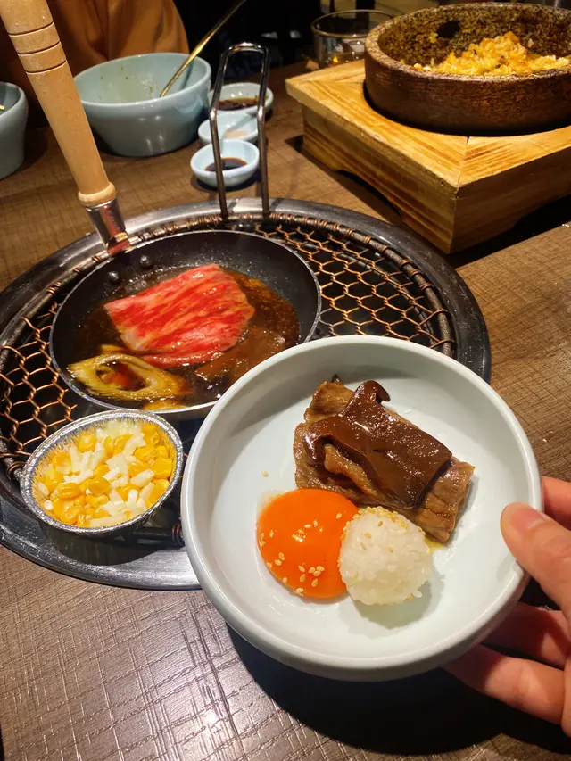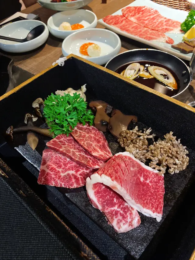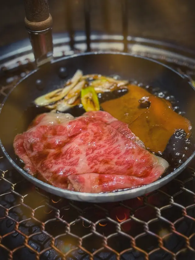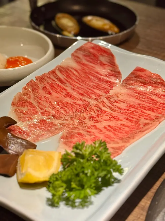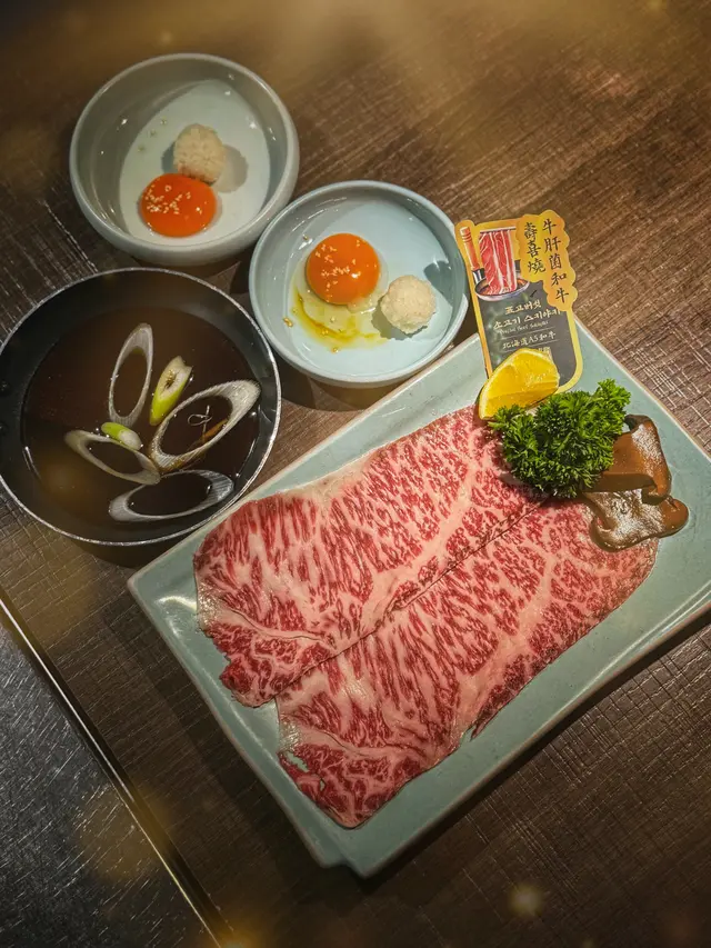 枱與枱之間距離夠闊, 坐得好舒服!!侍應會幫忙燒肉、睇火,唔使自己忙晒~~ 講解菜式又有禮貌, 啲用心位真心feel到~壽喜燒牛肝菌和牛 (2件) $185壽喜燒個汁甜中帶鹹, 有濃濃醬油香味~配上薄薄嘅和牛片, 油花分布靚到似大理石咁, 落鍋涮幾秒即收汁