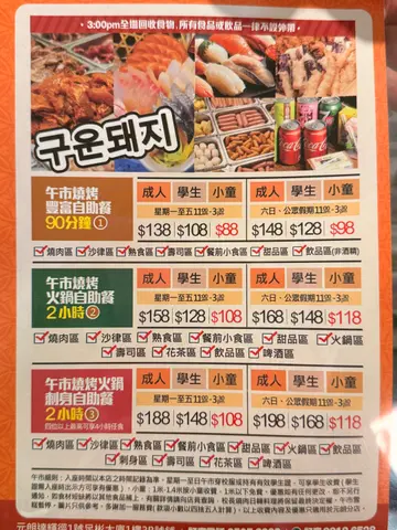 朋友帶咗我去元朗呢間燒烤放題,午餐$138/位任食2 小時,仲可以加錢一次過食到燒烤+火鍋+刺身,百幾蚊位呢個價錢真係幾經濟抵食,唔怪得平日午餐都好多家庭客& 學生來。自助區乾淨企理,分多個區域擺放食物,食物選擇算多。燒肉烤爐會有牛油紙可以自己換,烤肉冇咁容易燶,打邊爐嘅湯底都可以在自助區取。✨燒烤/ 火鍋配料區:✨燒烤肉類有各款豬、牛、雞、魚等,有唔同嘅醃料醃製,我自己就鍾意韓式醃豬扒同埋魚柳。亦有多款火鍋配料例如肥牛、丸類、豆卜、菇類、蔬菜等。✨刺身區/ 壽司區:✨刺身有赤蝦、三文魚、吞拿魚、希靈魚、榮螺片等,赤蝦大隻又鮮甜,我encore左幾次(刺身每次只限選3 款而赤蝦只限一隻)✨前菜沙律/ 冷盤區:✨沙律菜配料幾新鮮,冷盤區亦有不少開胃菜。✨小食/ 炸物/ 熱葷/ 點心區:✨蒸點心有我鍾意嘅魚肉燒賣,亦有不少街頭小食,香脆可口嘅炸物,還有老火湯、碗仔翅等。✨飲品區:✨各式飲品汽水/ 啤酒都有,最喜歡佢個花茶區,可以自選材料沖泡花茶,推介加少少洛神花,酸酸地很解渴消滯。✨甜品區:✨有唔少啫喱、奶凍,仲可以自己整涼粉冰粉甜品。…查看更多