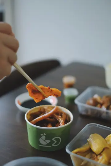 取外賣的時候已經發現好細盒,不過心諗無骨海南雞,冇咗骨,細盒正常。打開樣子也OK,有很多醬料,共三款,每款兩個。雞肉是有一點點粉紅色,應該屬於正常?拿去微波爐叮了一下。雞很多肥膏,除了幾件雞胸,其餘沒有什麼肉,全件肥膏,能吃的沒有多少。這半隻雞能吃的雞肉不及平時一隻雞髀。這張圖是吃剩的雞皮和肥膏,黑了一點是因為點了豉油。只能說剩下不能吃的,比能夠吃的還多