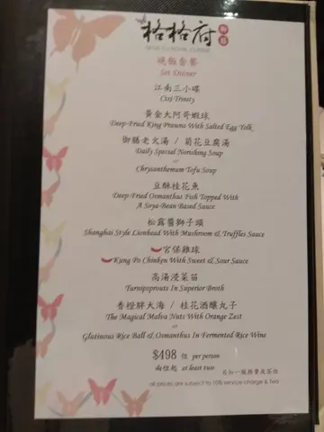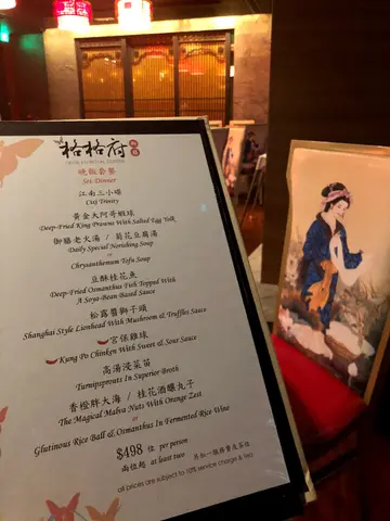 中菜廳也可以很有格調,一踏足餐廳,已經見到餐廳名字的紅色牌匾。餐廳燈光不是酒樓光猛,而是較柔和,舒服,環境恬靜,到處都放置中國風擺設、屏風,裝潢帶古色古香,連餐具、碗碟也十分別緻,予人雍容華麗的感覺,很有特色。進入餐廳時,旁邊有個服裝區放置宮廷古裝服飾,細問之下,原來可以讓食客cosplay,拍照之用,一嘗當皇上、皇后、格格的感覺。另外,店員態度有禮服務殷勤,值得一讚。江南三小碟:木耳、牛肉及粉皮,木耳以醋汁醃製,帶酸甜,開胃小菜;牛肉以陳醋味醃過,加上凝固狀的啫喱,更加濃味;麻辣粉皮那麻辣滋味齒頰留香。菊花豆腐湯:單單一碗湯,那豆腐條條切得細緻,雕琢得像綻開的菊花,稍為一不小心就會斷掉,的確是巧手功夫菜。湯也是清清的,不會油膩。松露醬獅子頭:豬肉丸子而成的獅子頭圓圓,上面鋪上一小勺松露,挺有驚喜的crossover。肉質夾雜肥豬肉,讓整個肉變得更加軟腍。墊底的小棠菜及菇片,作顏色點綴及除去膩感。宮保大阿哥蝦球:大蝦被薄薄的粉漿包裹著炸,蝦肉厚實,大大隻,味道酸酸甜甜,還有些甜椒粒伴碟,就如咕嚕肉那道菜的味道。麻婆豆腐配格格府炒飯:麻婆豆腐麻香,豆腐十分嫩滑易碎,肉末有助提鮮,最適合跟飯一拼吃,不過海鮮炒飯,幾口就吃完了,份量少。桂花糕:有點遜色,甜度高掩蓋了清淡幽香的桂花味,糕有點硬身,味道一般般。…查看更多