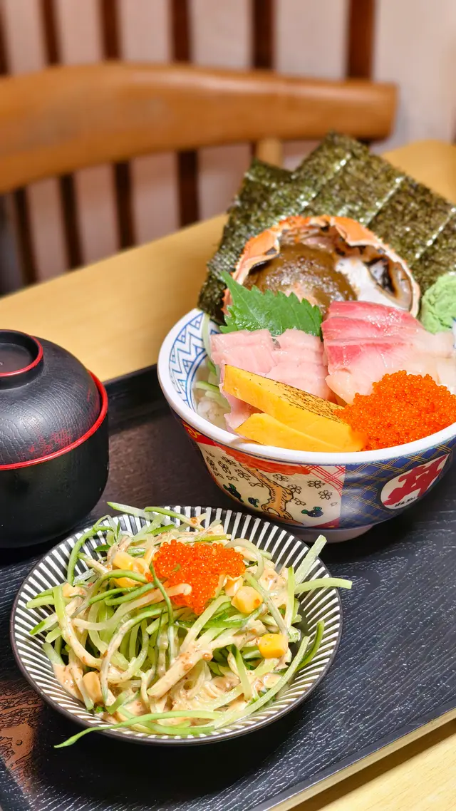 火炙三文魚蟹子丼配麵豉湯,雞肉棒串一客