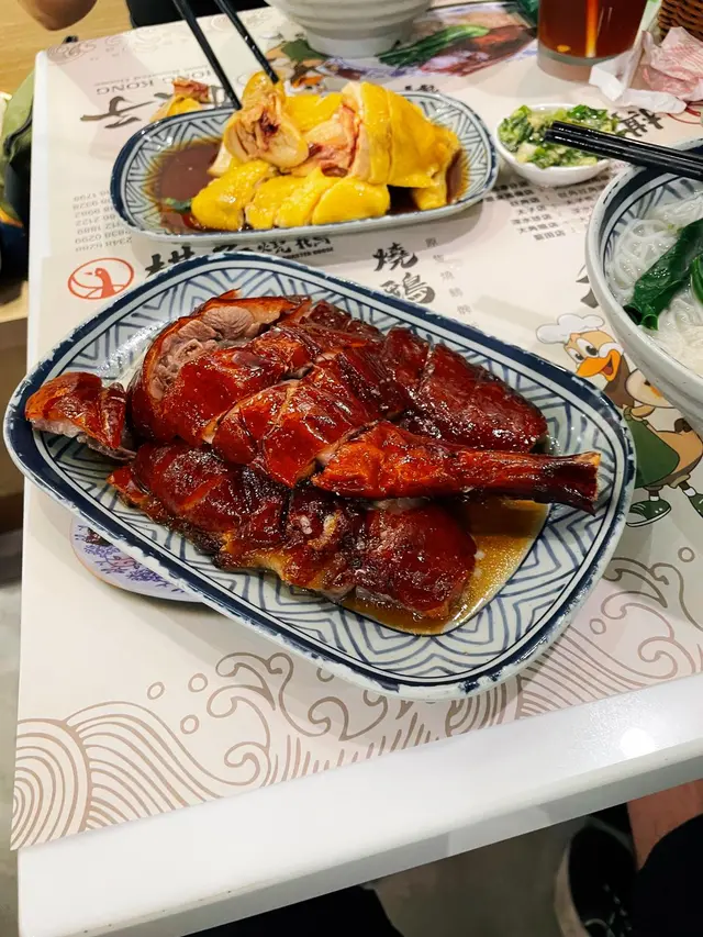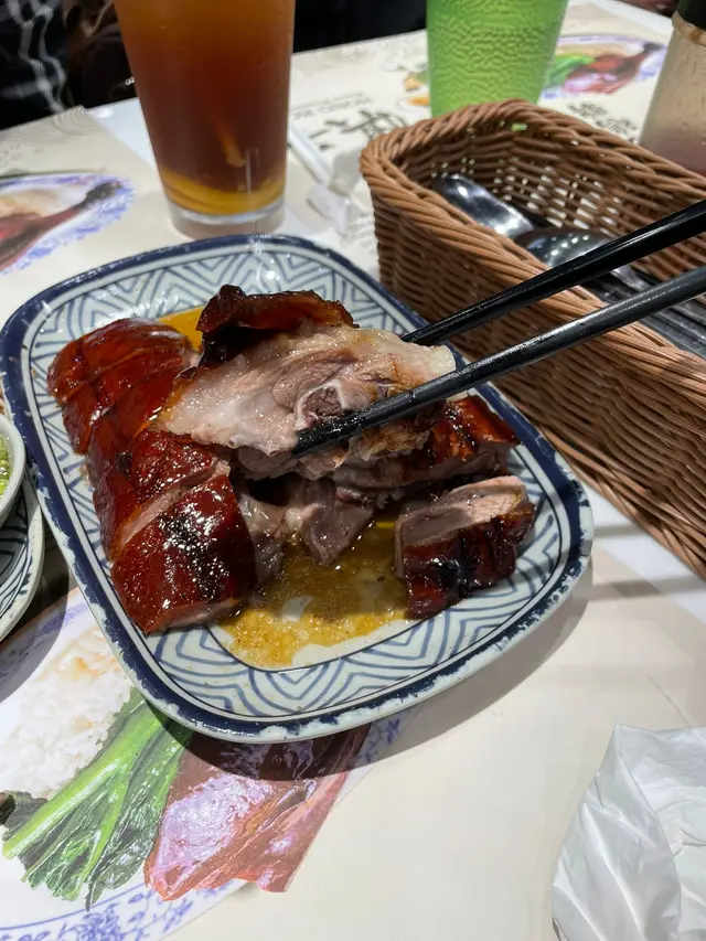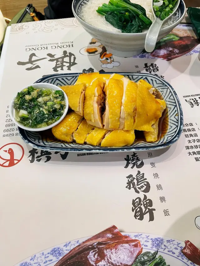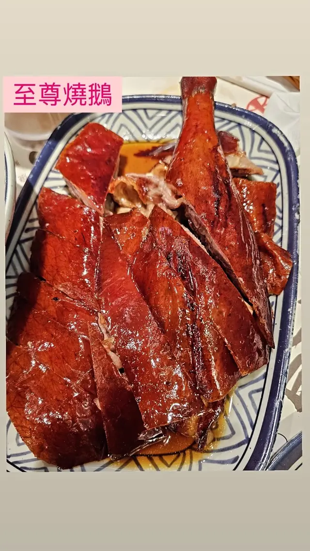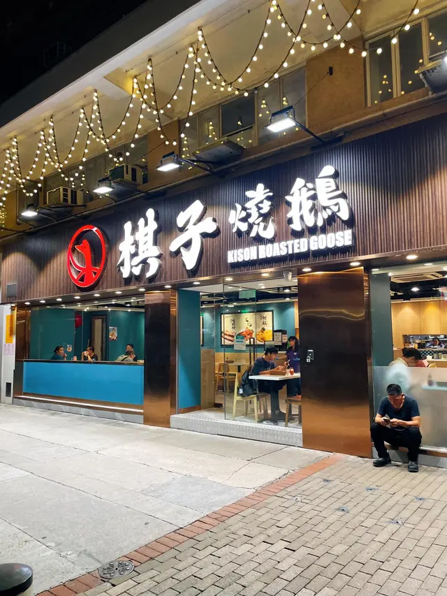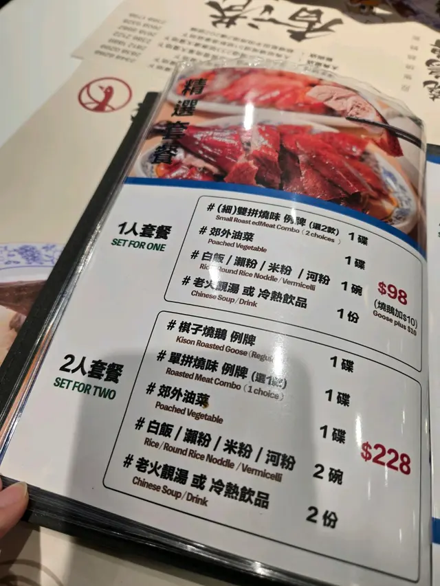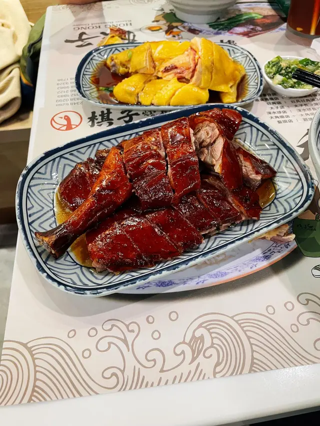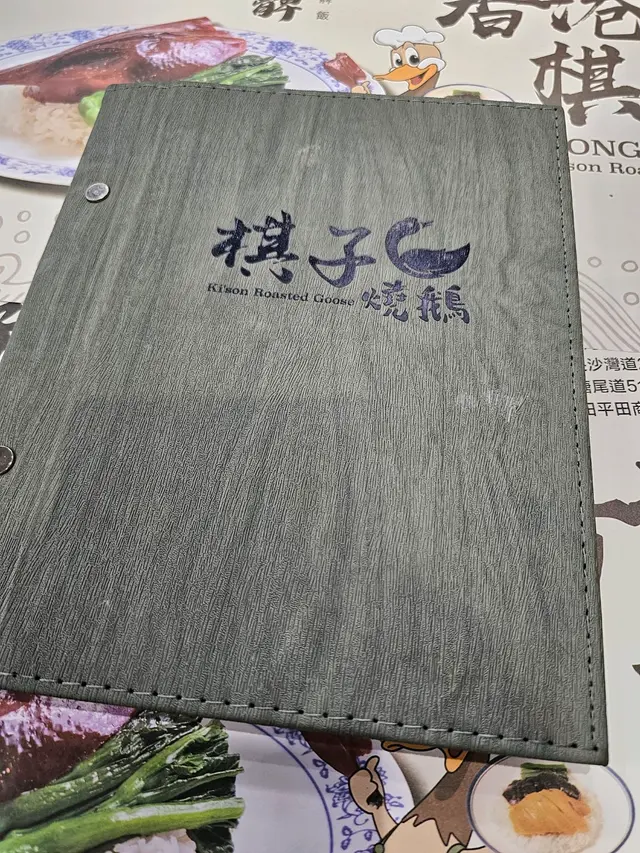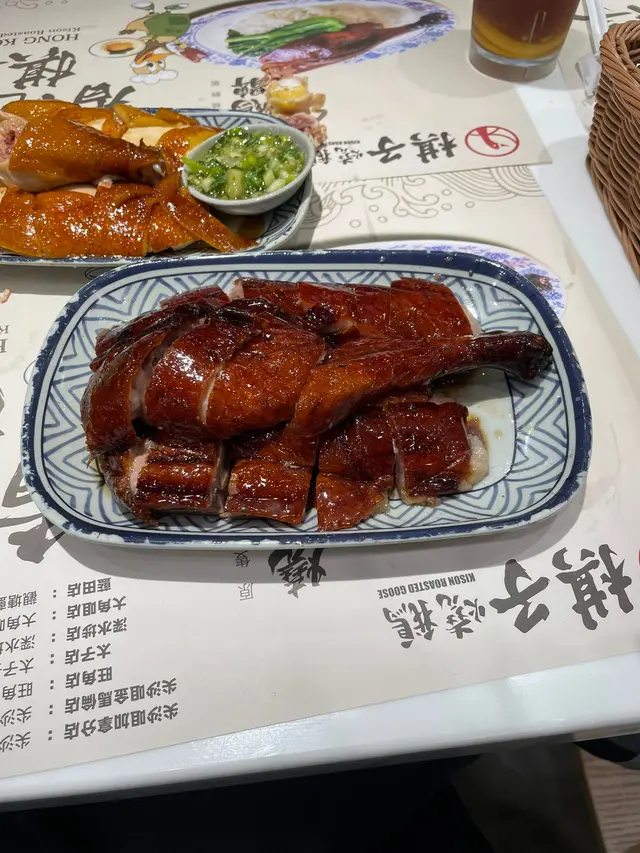 今晚放工正下著大雨, 在我們公司附近有 棋子燒鵝, 門面闊, 好亮麗. 立即 想食燒味餐. 門外有推薦食品, 外賣款式有多種. 玻璃櫃掛著的燒味, 觀感不俗. 燒鵝特別吸睛, 燒鵝頭多至數不清.餐廳面積大, 燈光明亮, 座位整潔闊落. 餐牌好清晰, 項目多, 全日常餐, 下午茶, 好正 !!我們點了 2人晚飯套餐. 有棋子招牌燒鵝, 單拼叉燒/燒肉, 有菜, 湯/茶, $228, 好扺食.先送來餐茶: 熱檸檬茶, 有檸香. 準備食燒味去膩. 例湯熱騰騰, 雞腳煲瘦肉湯, 無味精, 好飲. 蠔油菜心, 嫩綠少油, 爽口, 好健康. 招牌棋子燒鵝, 叉燒 各一碟, 送來了. 份量好滿意.燒鵝顏色立立令, 鵝肉厚厚, 少脂肪, 滲出陣陣炭燒香, 味香四溢, 鵝皮脆脆, 脆皮底下的鵝肉好鬆軟.配有秘制燒鵝酸梅醬, 點些醬汁很滋味, 送飯一流. 叉燒 , (可揀全瘦, 半肥瘦及肥义) 我們選擇了半肥瘦. 燒得香, 賣相也不錯. 用了五花腩肉, 吾肥有蜜汁. 不油膩, 真滋味.湯瀨粉, 把青蔥分隔開, 瀨粉好滑, 湯頭甜.配燒鵝, 一流好食. 白飯粒粒完整, 雪白分明, 用上靚米.招牌棋子燒鵝 好好味 , 食得非常滿意. 叉燒也不俗好回味. …查看更多